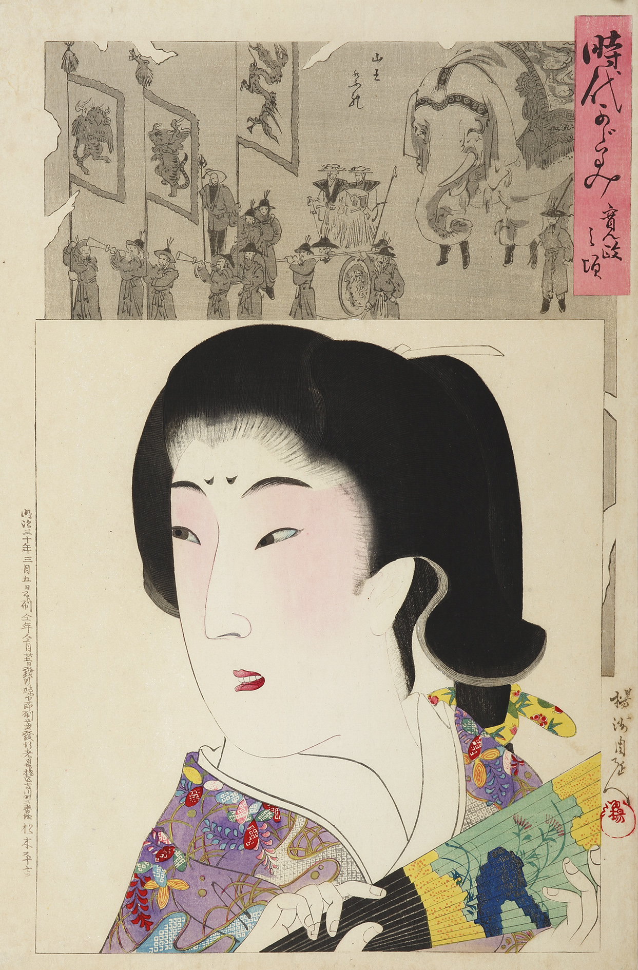 Wonderful Japanese oban tate-e  (size) woodblock print of okubi-e (bust portraits) of a Binjin (beautiful woman) depicted in a sumptuous costume, from Chikanobu’s famous series, titled Jidai kagami (Mirror of the Ages). Chikanobu documented the fashions of former times (from the Kenmu to the Meiji era) with a  portrait of a beauty depicted in the lower section and a rectangular panel at top making a reference to the era. Published by Matsuki Heikichi, dated between Meiji 29 and 30 (1896-7), signed Yoshu Chikanobu.