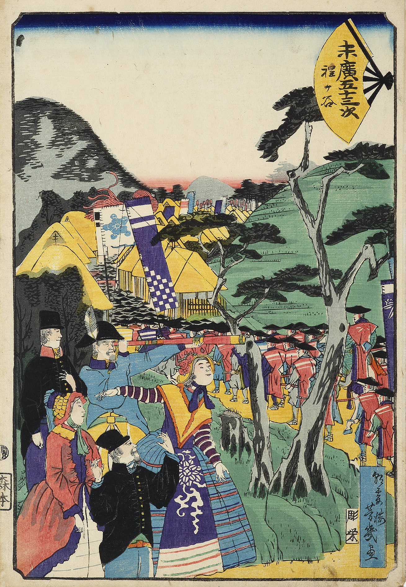 Magnificent woodblock by Utagawa Yoshiiku ( 1833 – 1904) of the post-town of Hodogaya, the fourth station on the Tokaido*. Yoshiiku depicts foreign tourists watching the shogun’s procession entering the town with numerous Uma-jirushi * and banners adorned with his mon*.