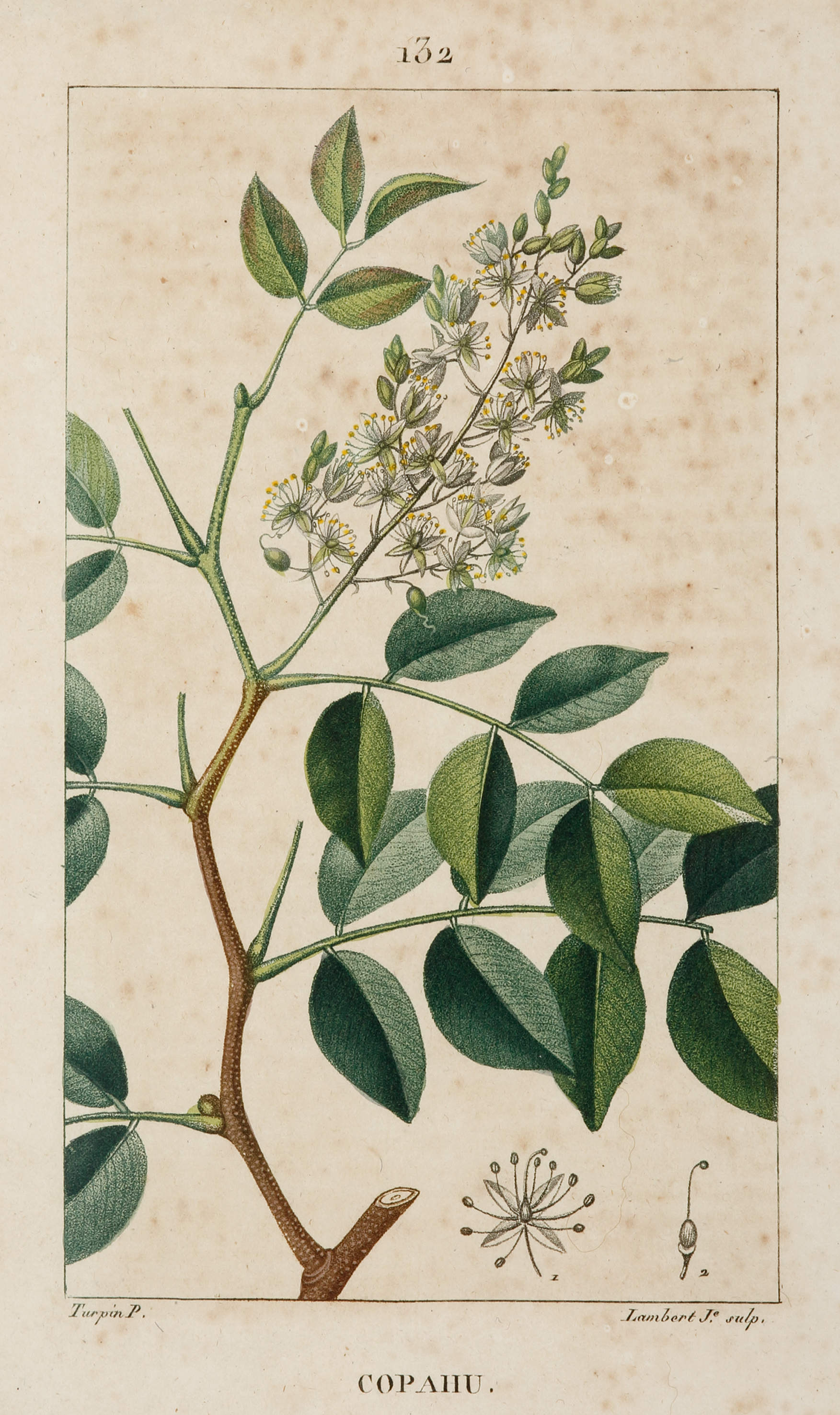 Very fine stipple engraving of the Copaiba which is a source of biodiesel, because of the high yield of 12,000 liters per ha. The resin is tapped from standing trees, with an individual tree yielding 40 liters per year. Copaiba has also been used in traditional medicine.
