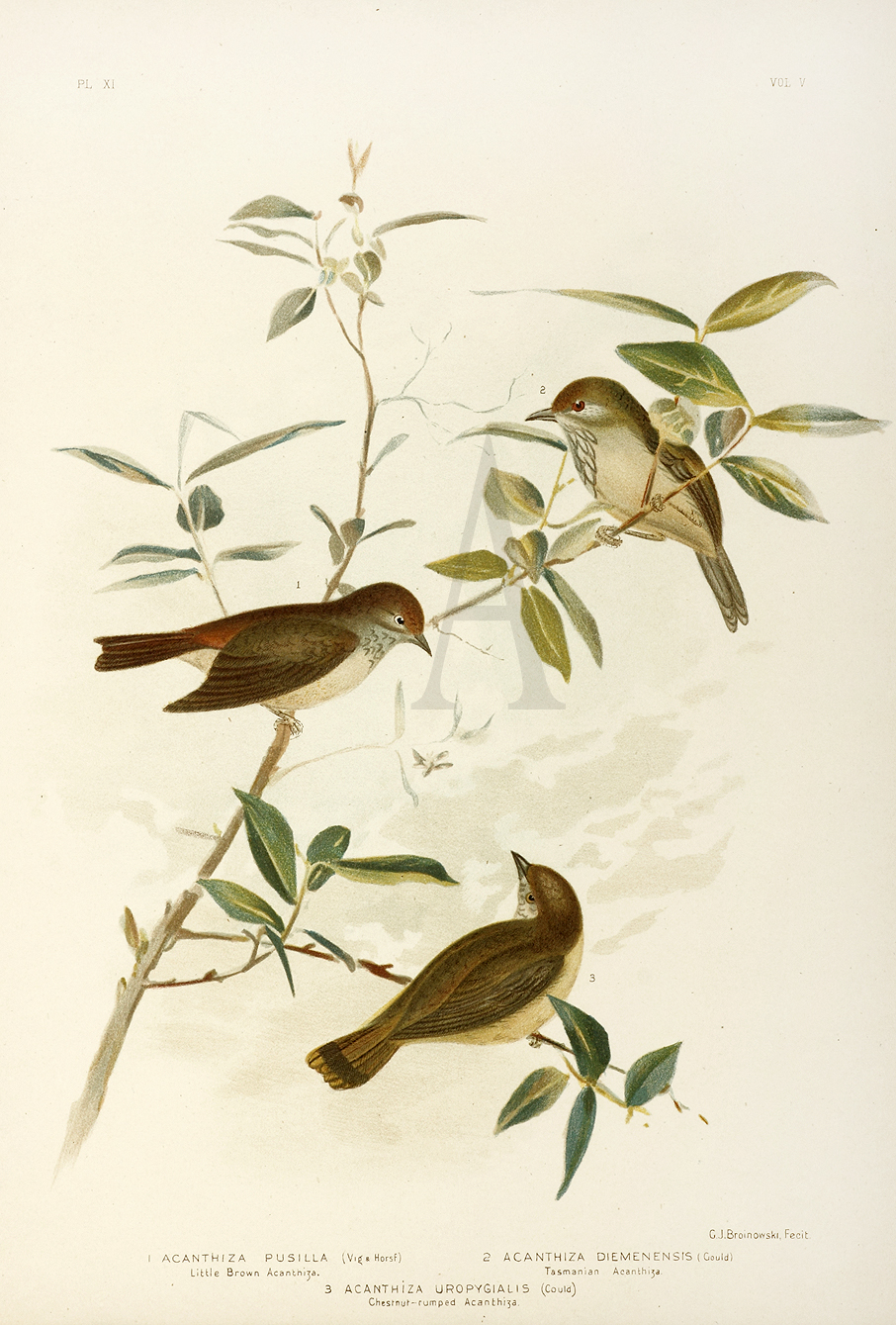 1.Acanthiza Pusilla. Little Brown Acanthiza. 2.Acanthiza Diemenensis. Tasmanian Acanthiza. 3.Acanthiza Uropygialis. Chestnut-rumped Acanthiza. - Antique Print from 1889