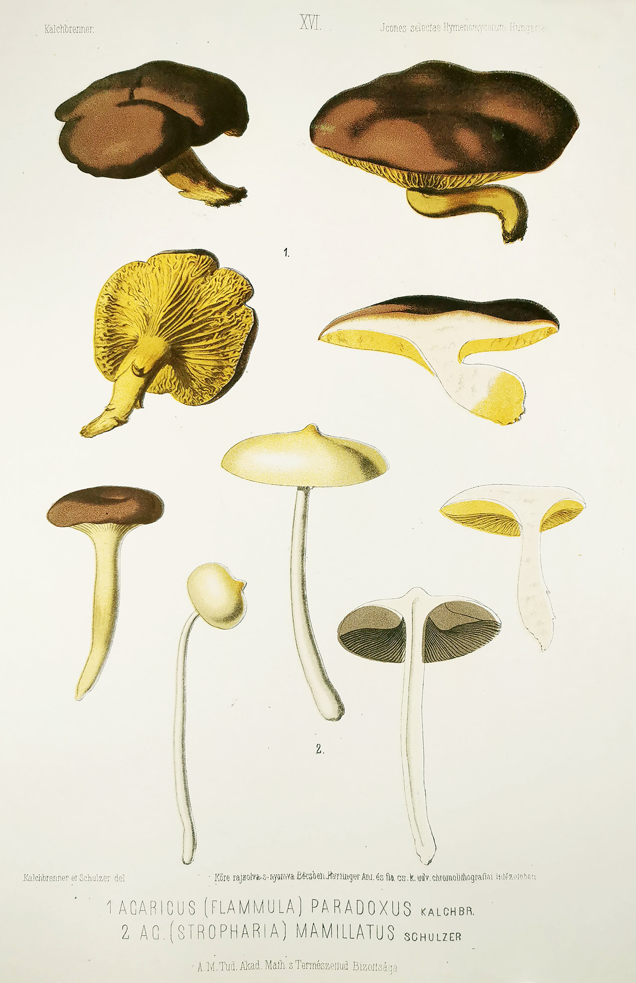 Rare c.19th mushroom lithograph. From Kalchbrenner, K. Icones selectae Hymenomycetum hungariae. Budapest 1877.