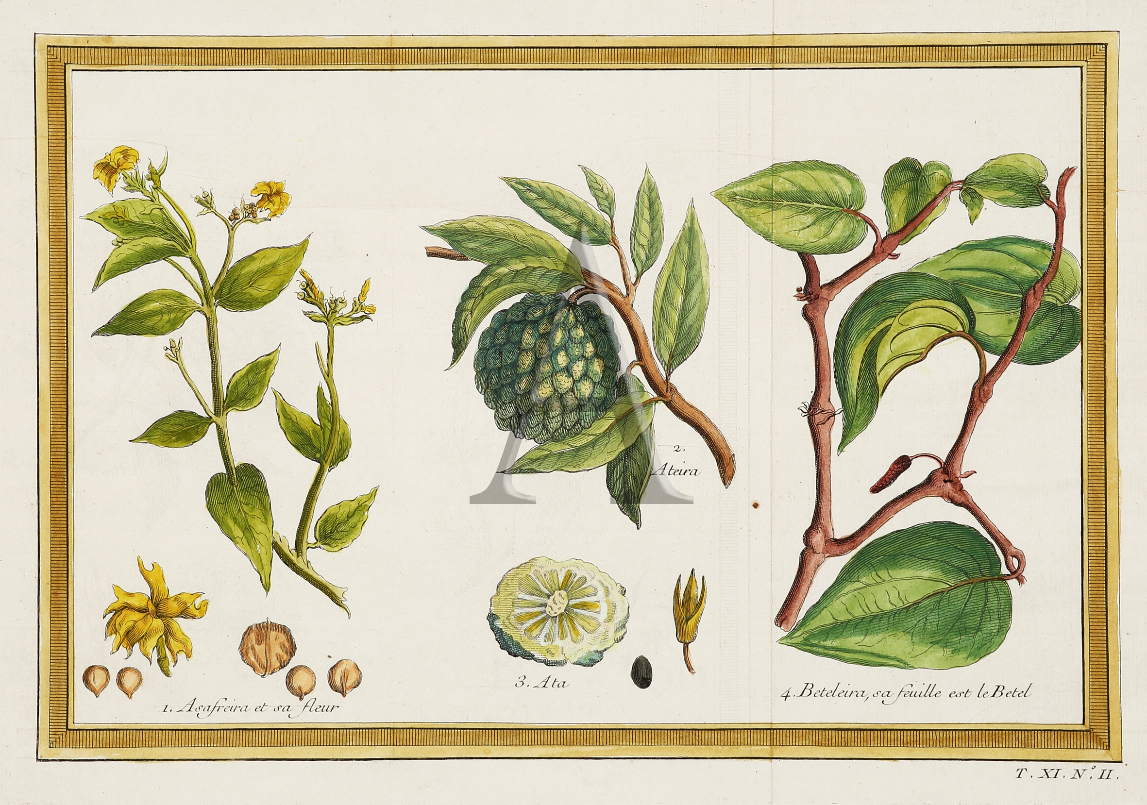 1. Asafreira et sa fleur. 2. Ateira. 3. Ata. 4. Beteleira, sa feuille est le Betel. - Antique Print from 1753