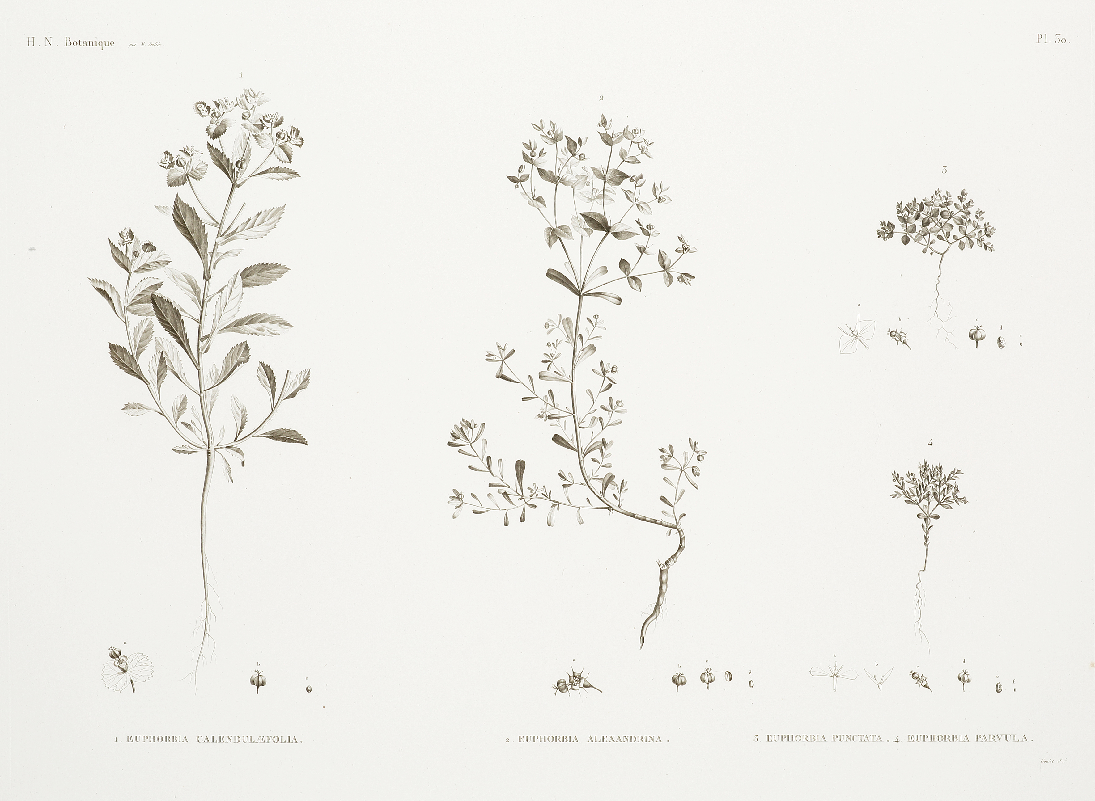 1. Euphorbia Calendulaefolia 2. Euphorbia Alexandrina 3. Euphorbia Punctata 4. Euphorbia Parvula - Antique Print from 1819