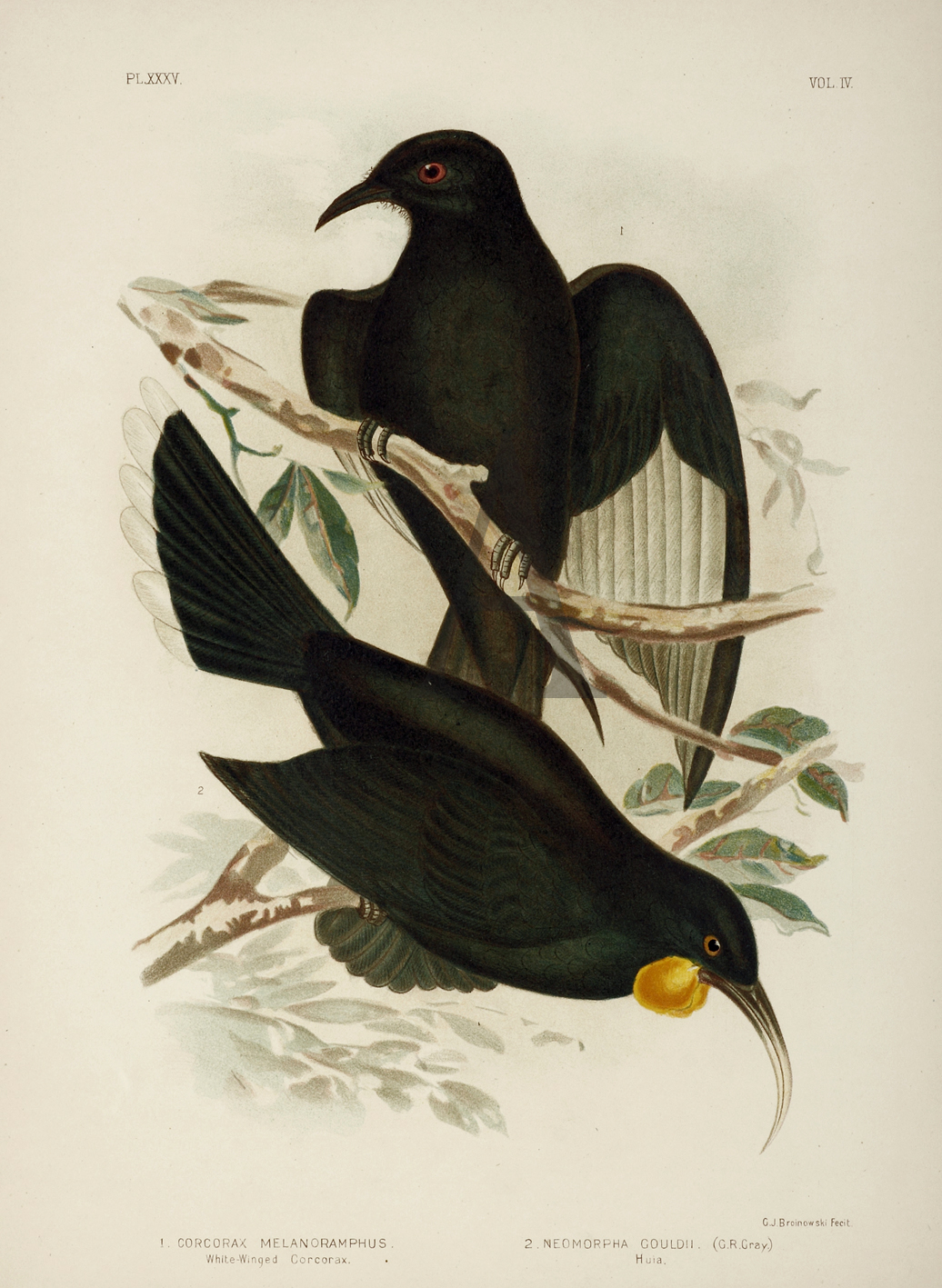 The Huia’s distinctive white-tipped black tail feathers were often worn by Maori chiefs as a sign of their status. Such feathers were revered as taonga (treasures) by them.
