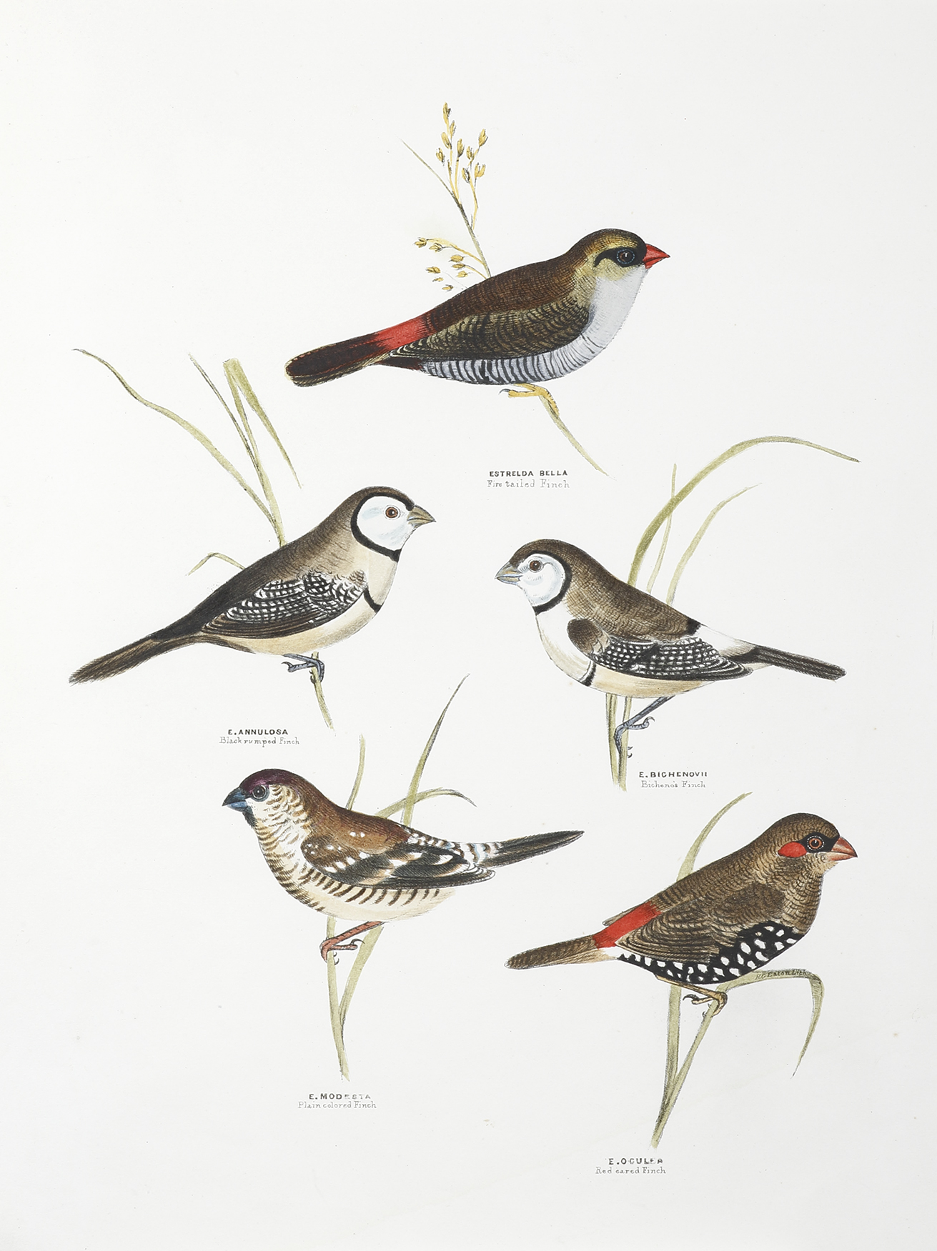 Very rare lithograph of Finches from Silvester Diggles, The Ornithology of Australia. This work is one of the great rarities of Australian ornithology.