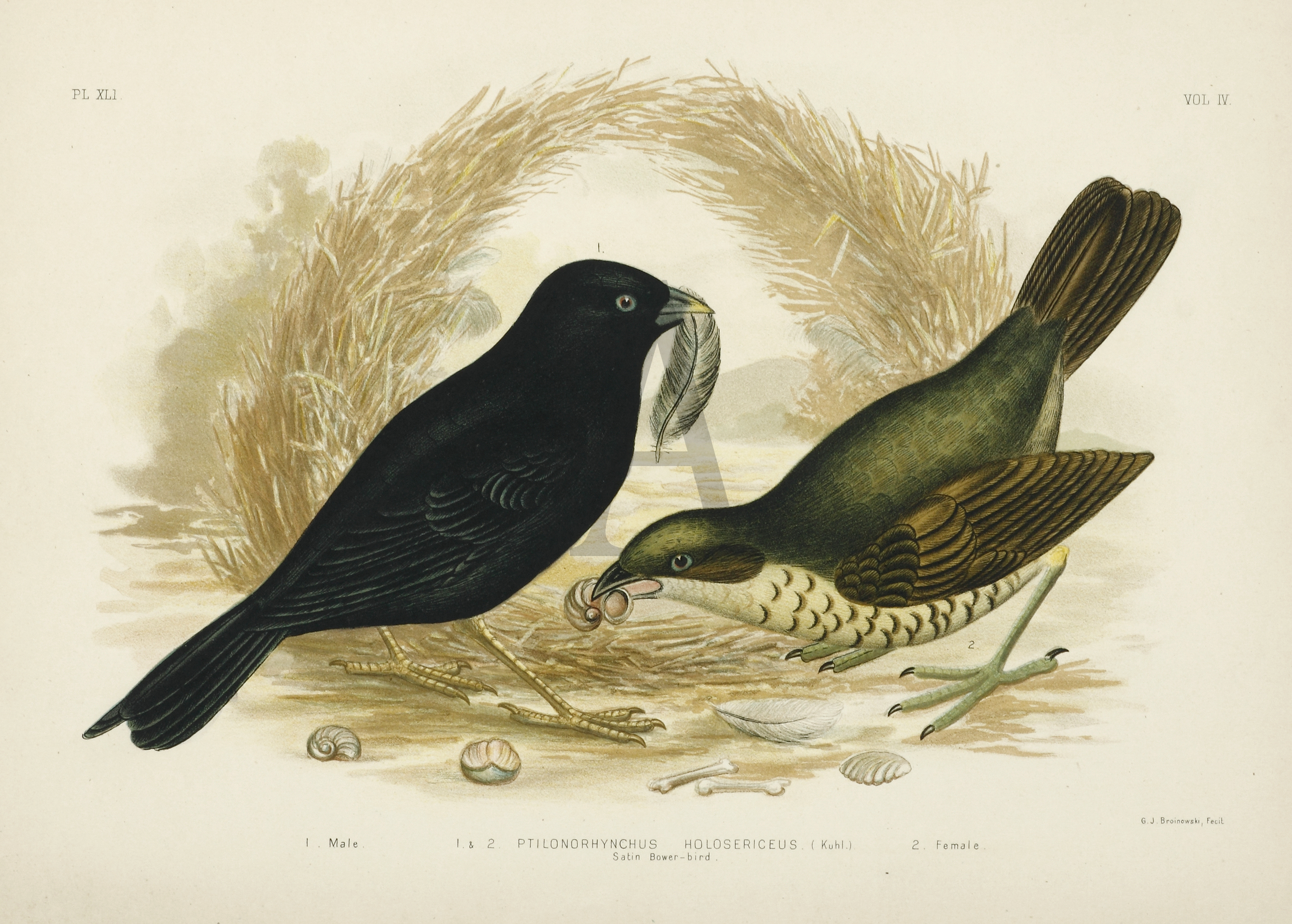 Modern common name: Satin Bowerbird Modern binomial name: Ptilonorhynchus violaceus First described: Vieillot 1816. Distribution VIC NSW & QLD From Gracius Broinowski (1837-1913) The Birds of Australia . References: Ferguson, J. A. Bibliography of Australia Volumes 1-8, Canberra 1976 7458. Collections: … Read Full Description
