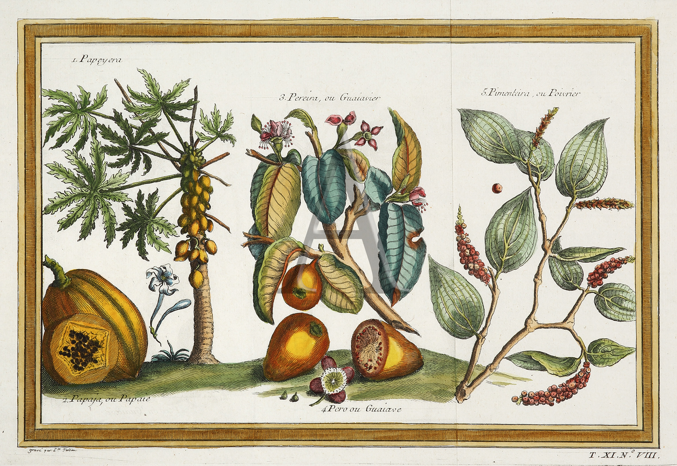 Scarce c.18th hand coloured engraving of tropical fruits, inlcuding papaya. From Prevost, Abbe. Histoire générale des voyages : ou, Nouvelle collection de toutes les relations de voyages par mer et par terre qui ont été publiées jusqu’à présent dans les différentes … Read Full Description