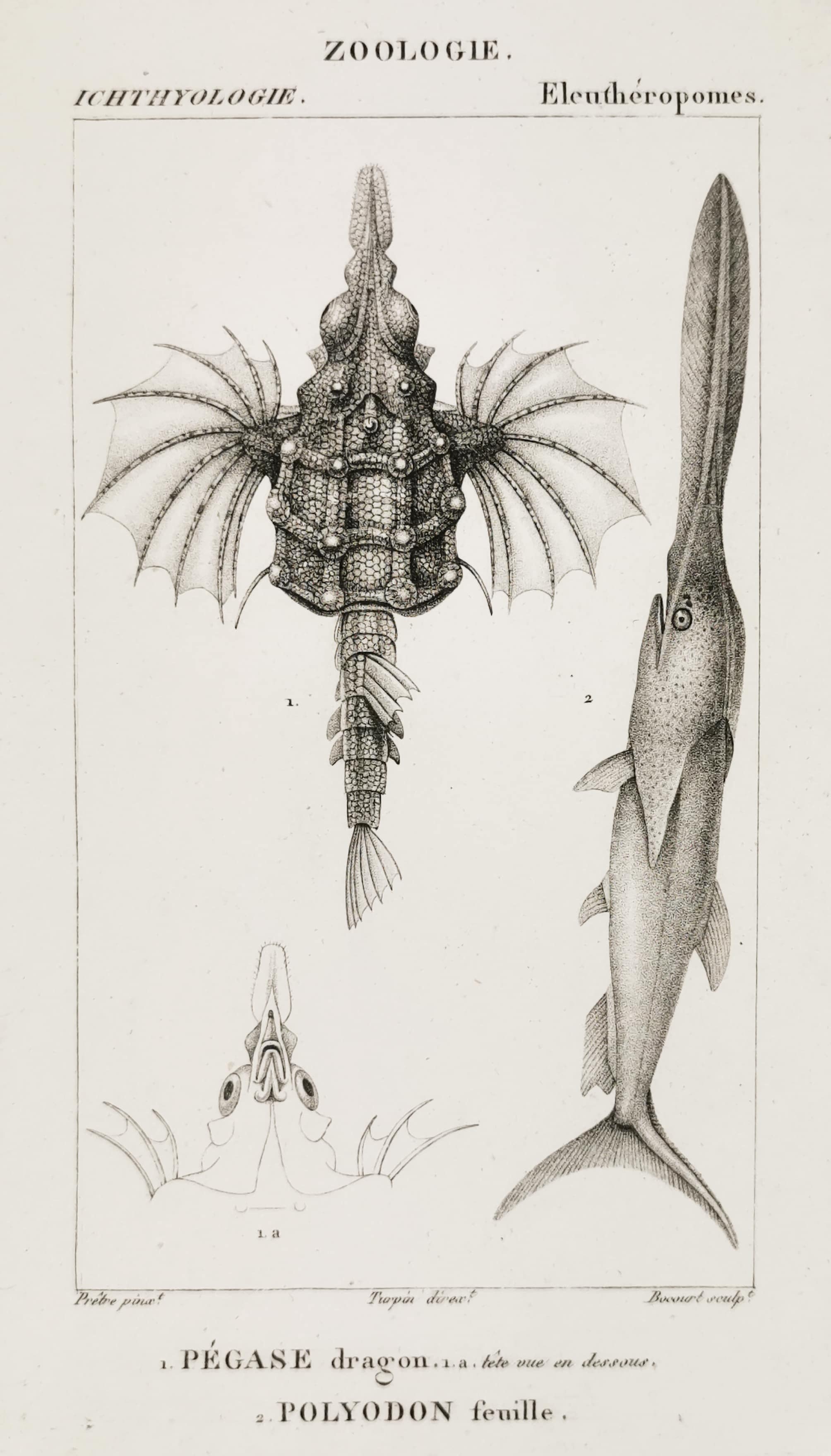 Print of the little Dragonfish and American Paddlefish. From the book Dictionnaire des Sciences Naturelles by Anselm-Gäetan Desmarest (1784 – 1838)