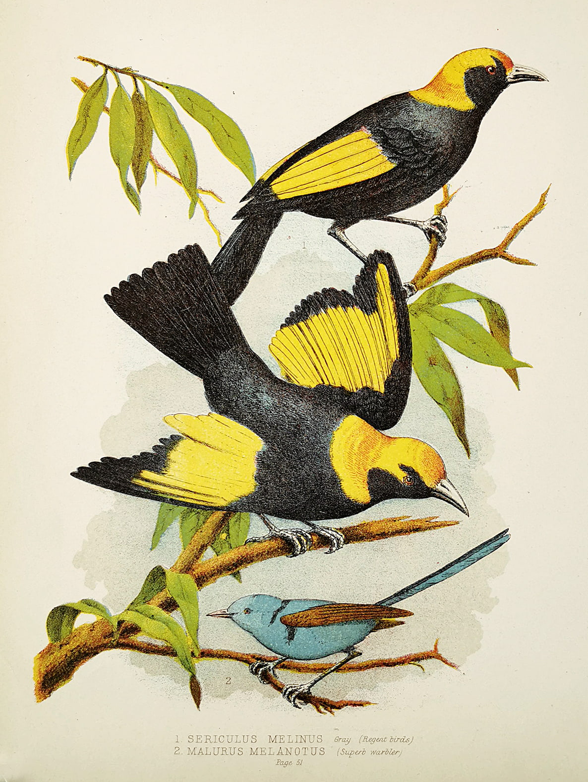 C.19th lithograph of the Regent Bowerbird and the Blue wren.
