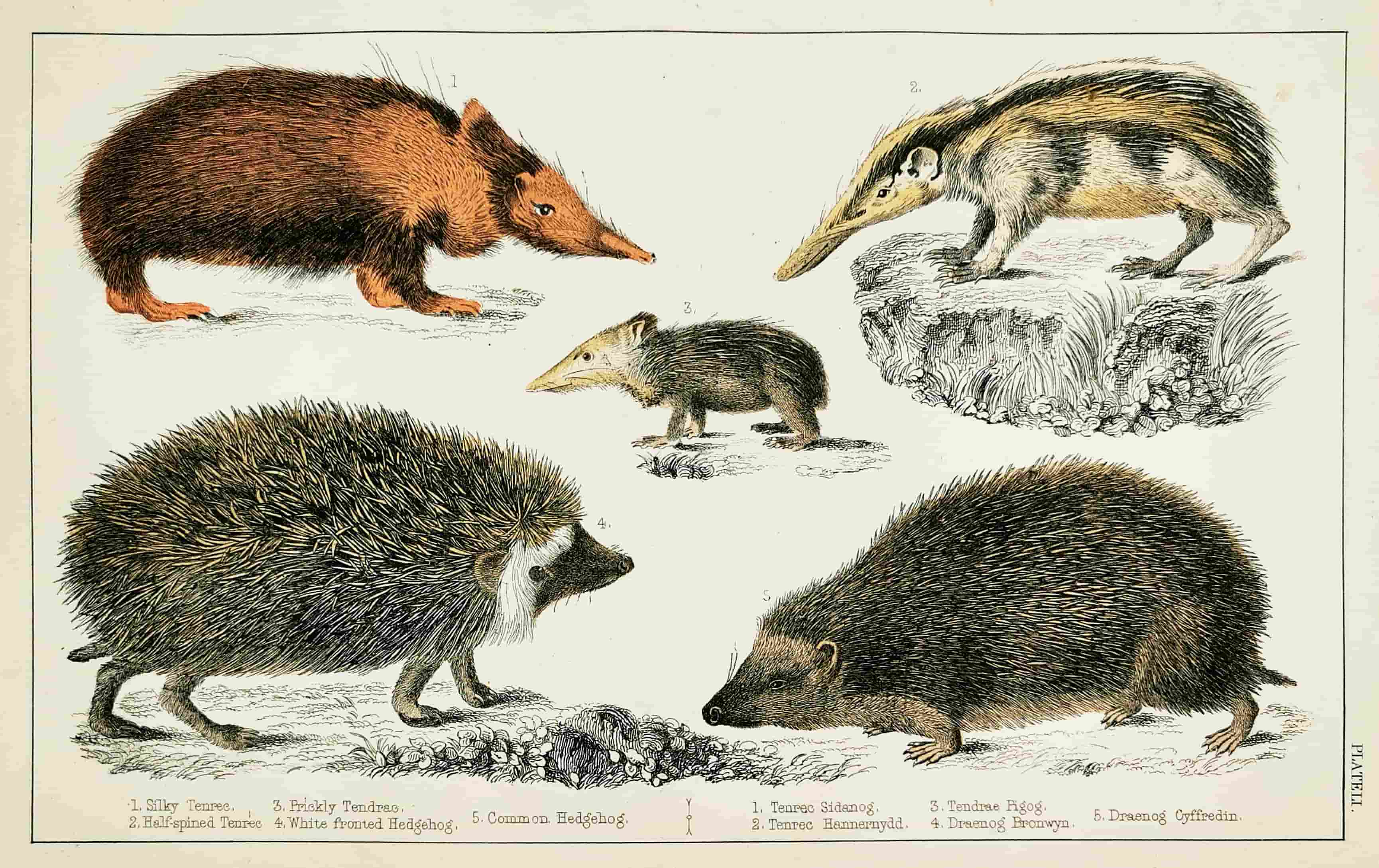 C19th engraving of hedgehog with original hand colouring. From The Museum of Natural History.