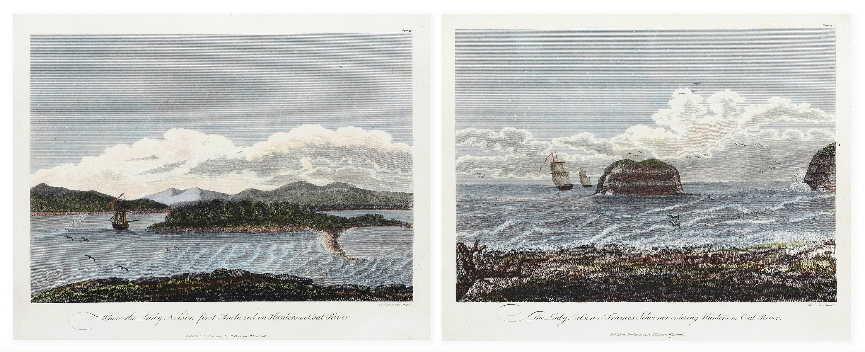 Rare pair of early c.19th hand coloured engravings of Newcastle by John Lewin, published in 1804. These are the earliest printed views of Newcastle. Following the discovery of the area by Lieutenant John Shortland on 9 September 1797, while in … Read Full Description