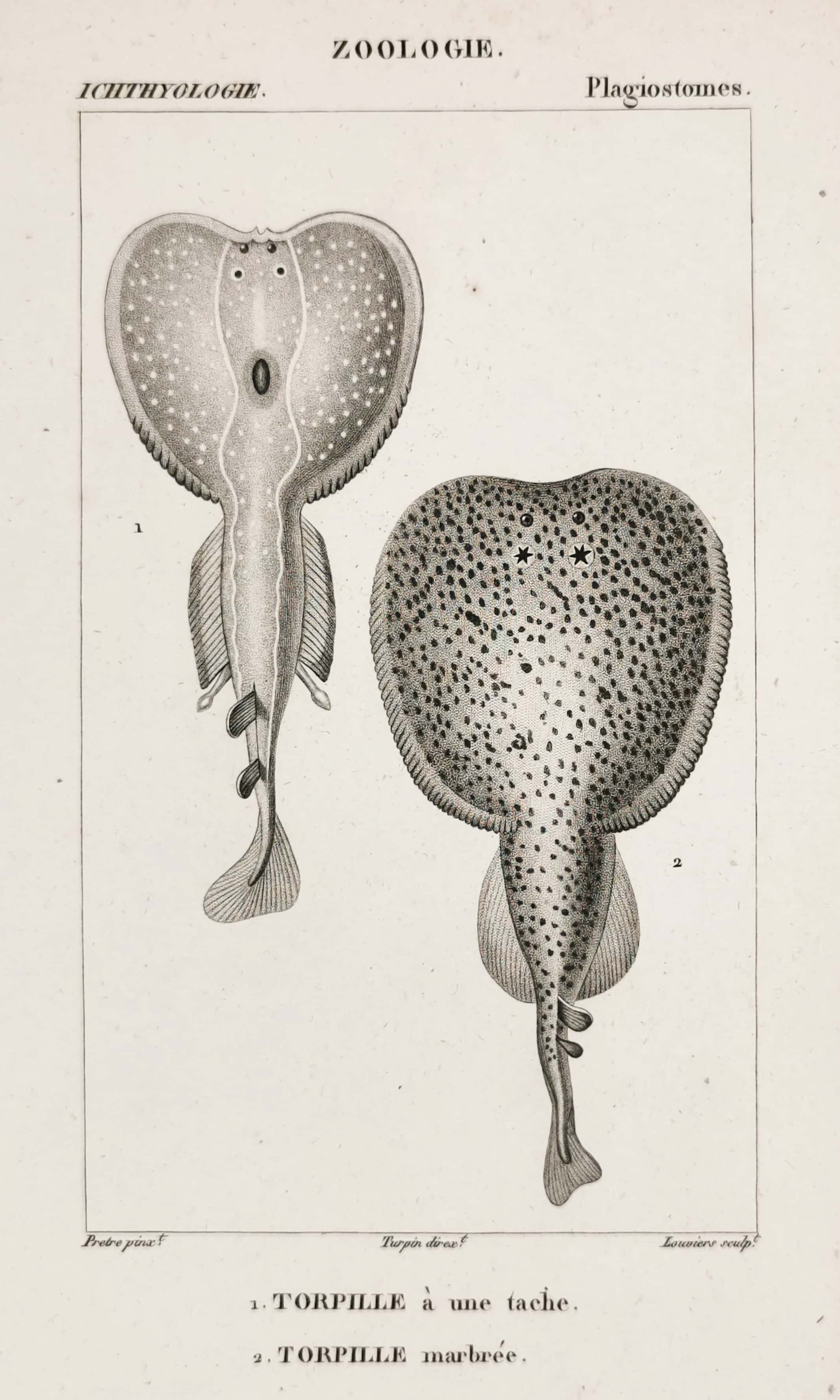 Print of Electric Rays. From the book Dictionnaire des Sciences Naturelles by Anselm-Gäetan Desmarest (1784 – 1838)