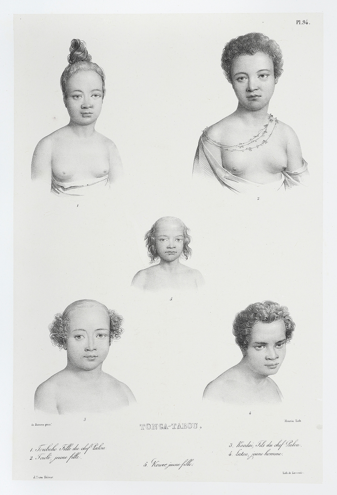 First edition of this superb Chine-collé lithograph on India paper of five Tongans by Louis de Sainson artist aboard the famous Dumont D’Urville voyage of scientific discovery and exploration.
