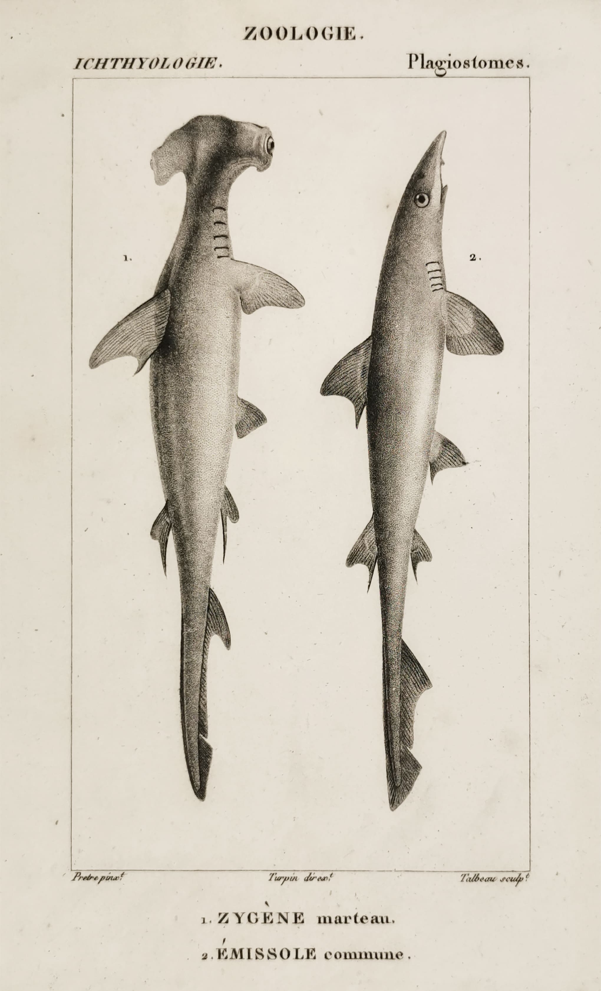 Print of the hammerhead shark and houndshark. From the book Dictionnaire des Sciences Naturelles by Anselm-Gäetan Desmarest (1784 – 1838)
