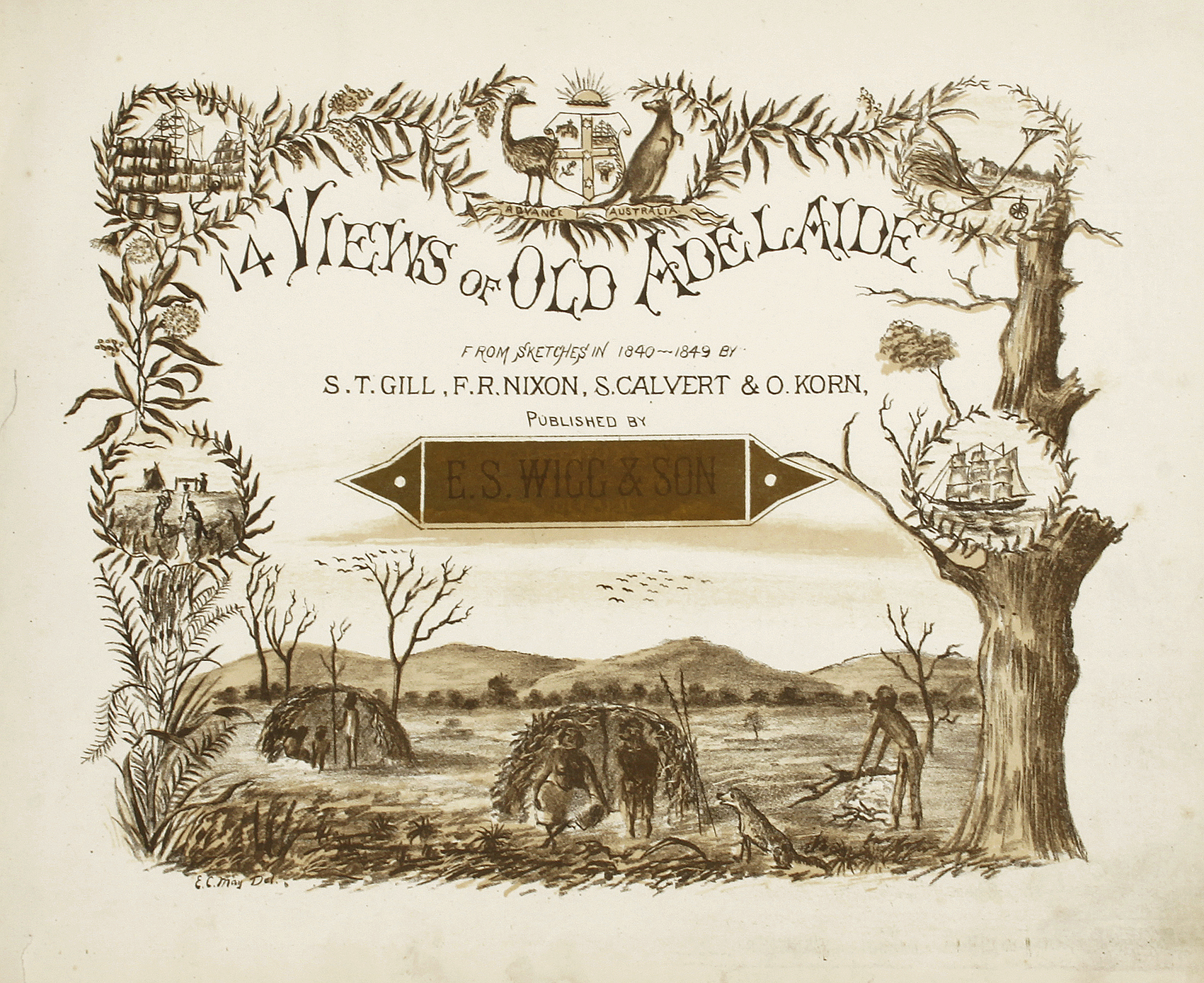 Full dark brown Morocco bound collection of fourteen lithographic views of Adelaide in the “Early Days’ by E.S. Wigg. Oblong quarto, gilt pictorial title page by Edgar C. May (1867-1920), 14 full page lithographic views each with a tissue guard, index of plates placed in between plate 4 & 5, 3 page list of 181 subscribers.
