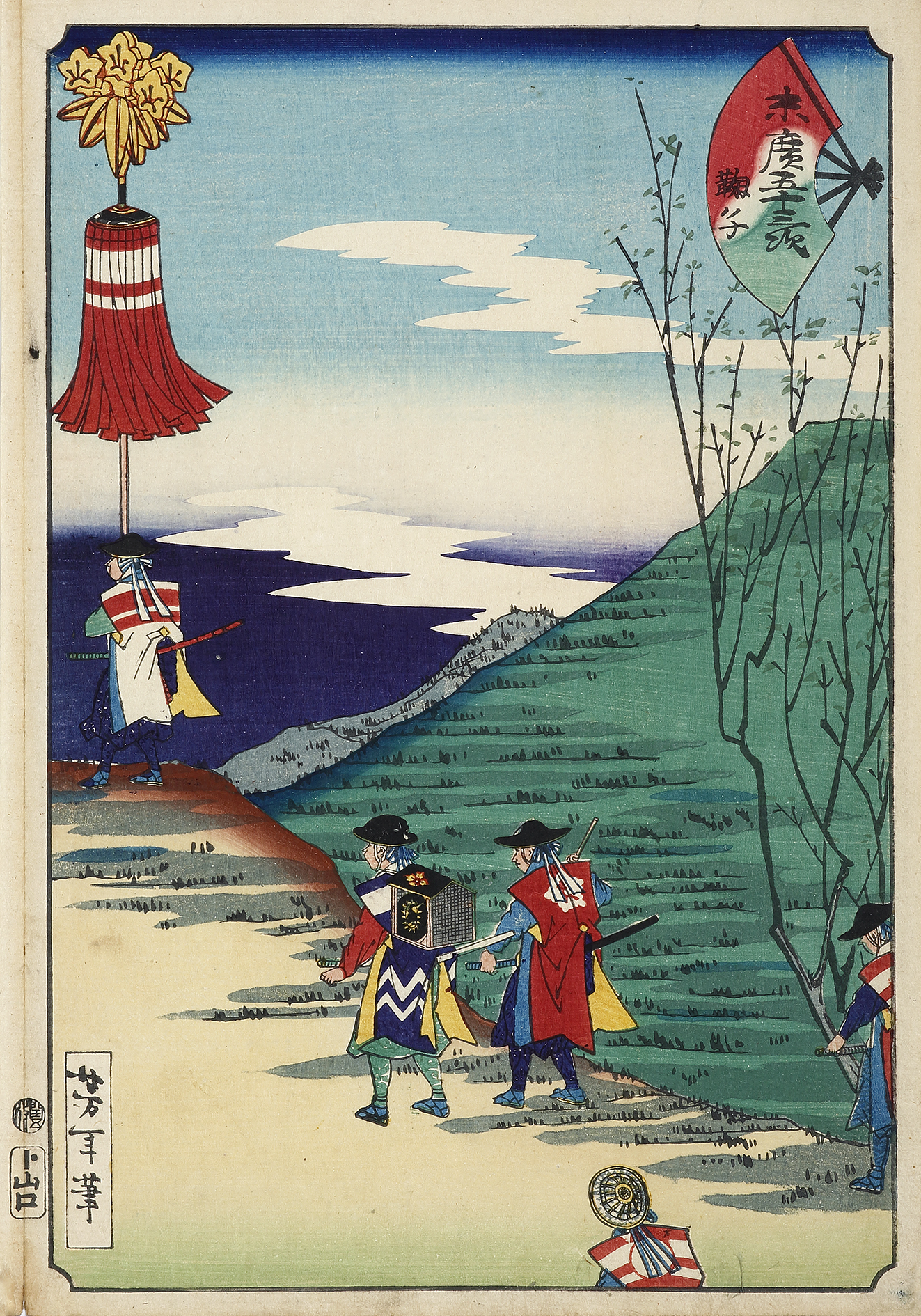 The views in this series depict the journey of Tokugawa Iemochi (1846-1866) the 14th shogun of the Tokugawa shogunate from Edo to Kyoto on April 22, 1863 who had been summoned by the emperor. This was the first time in 230 years that a shogun had visited Kyoto. He travelled with over 3,000 retainers as an escort and with all the pomp and ceremony that was expected of a shogun. The leading retainer is holding a large Uma-jirushi* with the Mon of the Tokugawa clan, shogunate (1600–1868).