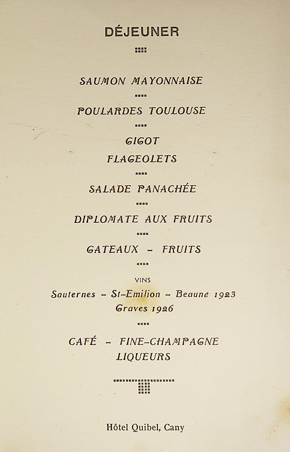 French menu from Hotel Quibel, Cany.