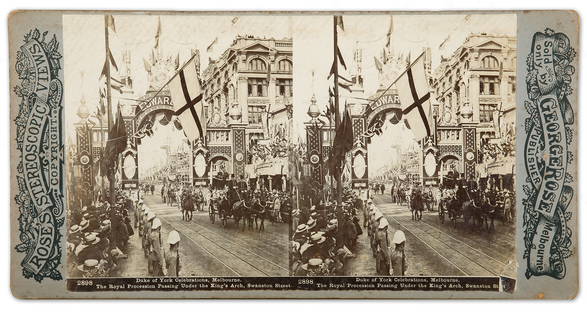 Australian Federation Stereo card of the King Edward VII Arch, Swanston Street, by George Rose, recording the visit of The Duke and Duchess of Cornwall and York to Melbourne in May 1901, for the Federation celebrations. The King Edward VII Arch was one of eight grand ceremonial arches marking the route to be travelled by the royal carriage on the journey to and from the Exhibition Building.