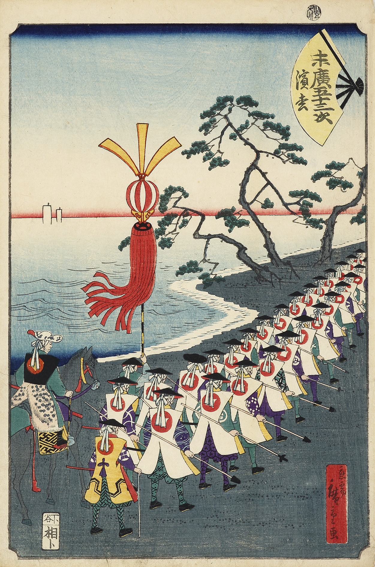 The views in this series depict the journey of Tokugawa Iemochi (1846-1866) the 14th shogun of the Tokugawa shogunate from Edo to Kyoto on April 22, 1863 who had been summoned by the emperor. This was the first time in 230 years that a shogun had visited Kyoto. He travelled with over 3,000 retainers as an escort and with all the pomp and ceremony that was expected of a shogun.
