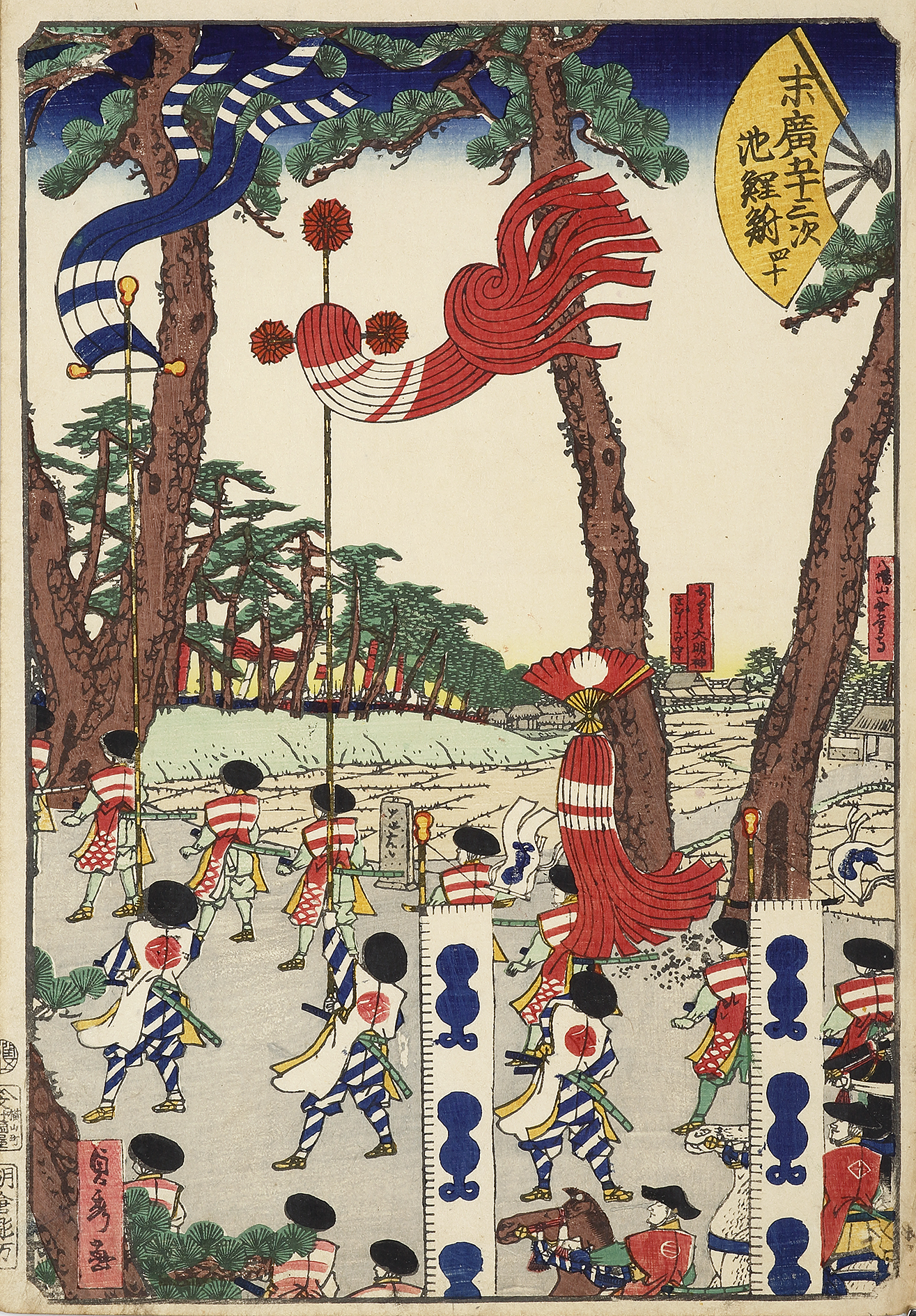 The views in this series depict the journey of Tokugawa Iemochi (1846-1866) the 14th shogun of the Tokugawa shogunate from Edo to Kyoto on April 22, 1863 who had been summoned by the emperor. This was the first time in 230 years that a shogun had visited Kyoto. He travelled with over 3,000 retainers as an escort and with all the pomp and ceremony that was expected of a shogun. He is seen entering the town on his horse surrounded by retinue displaying the shogun’s Uma-jirushi.