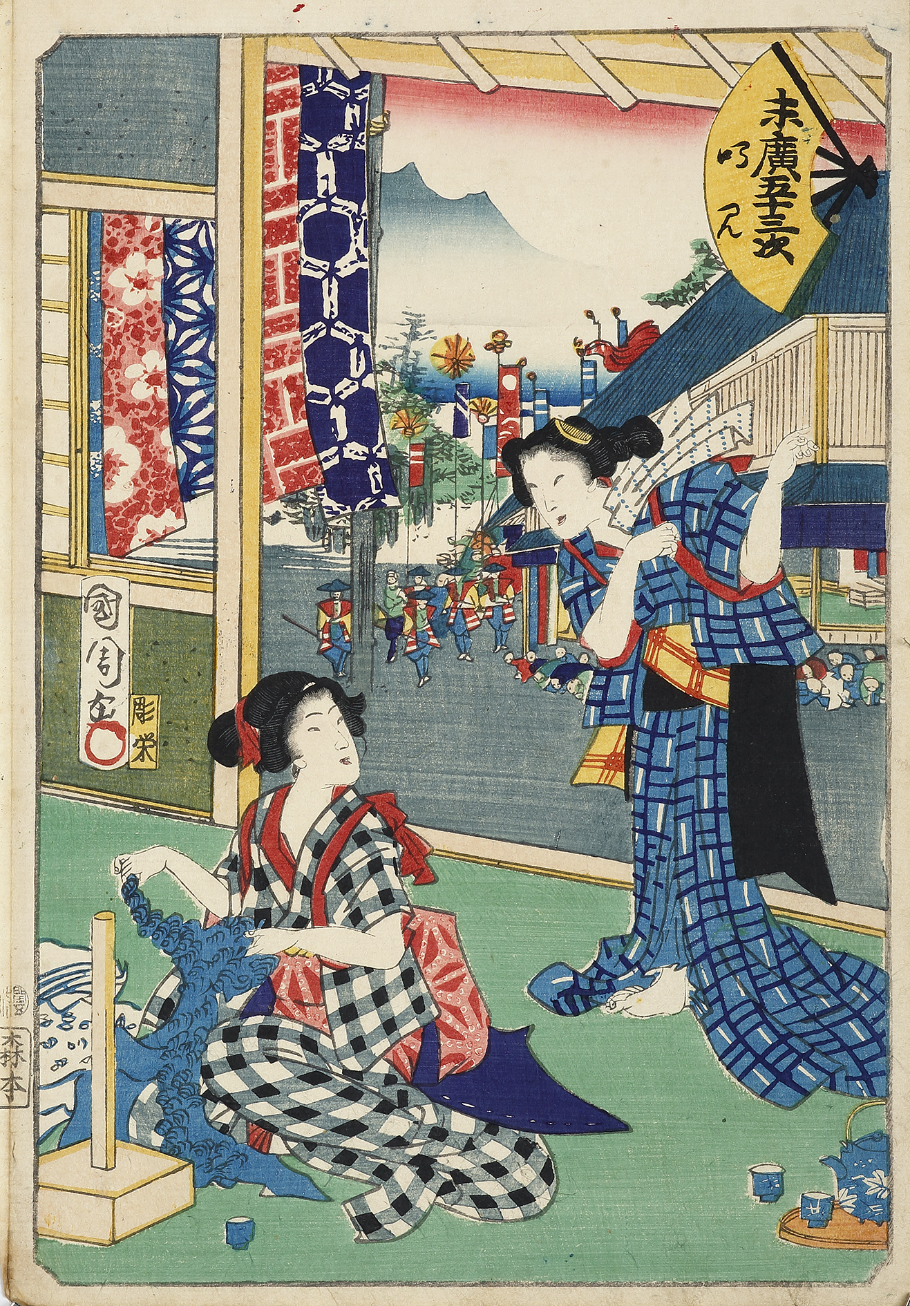 Magnificent woodblock by Toyohara Kunichika ( 1835 – 1900)) of the post-town of Narumi, the fortieth station on the Tokaido*, Its located in what is now part of the Midori-ku area of the city of Nagoya. The print depicts two women in a fabric shop looking a tie-died cloth which was typically used for making yukata summer kimono, and which was a speciality of the region. The shogun and his retinue can be seen in the background with Uma-jirushi * flying embellished with his mon*.