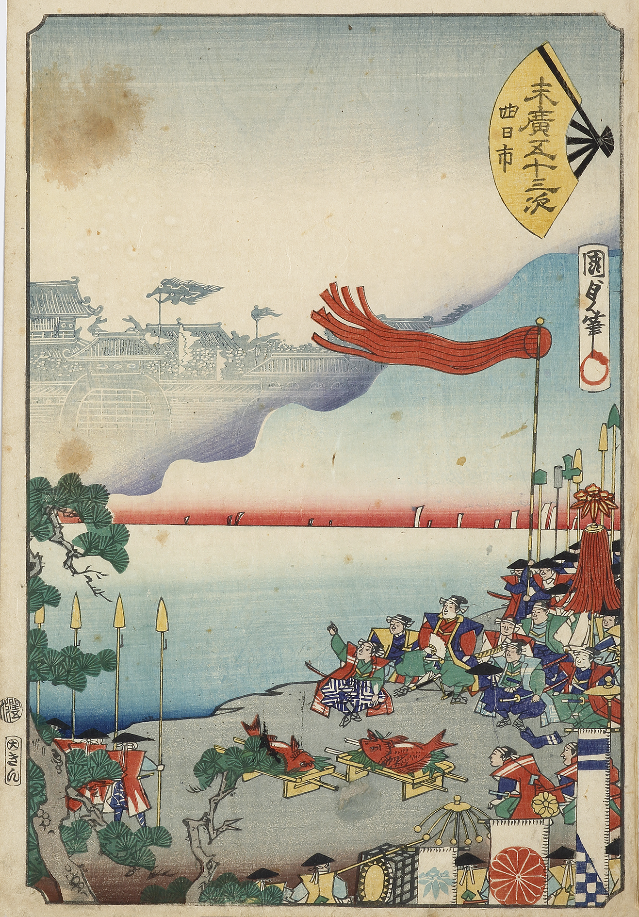 Magnificent woodblock by Utagawa Kunisada II (1823-1880) of Yokkaichi the forty third station on the Tokaido* The print shows the shogun and his entourage having a meal of very large fish with his Uma-jirushi * flying and with banners with his mon* displayed in the lower right.