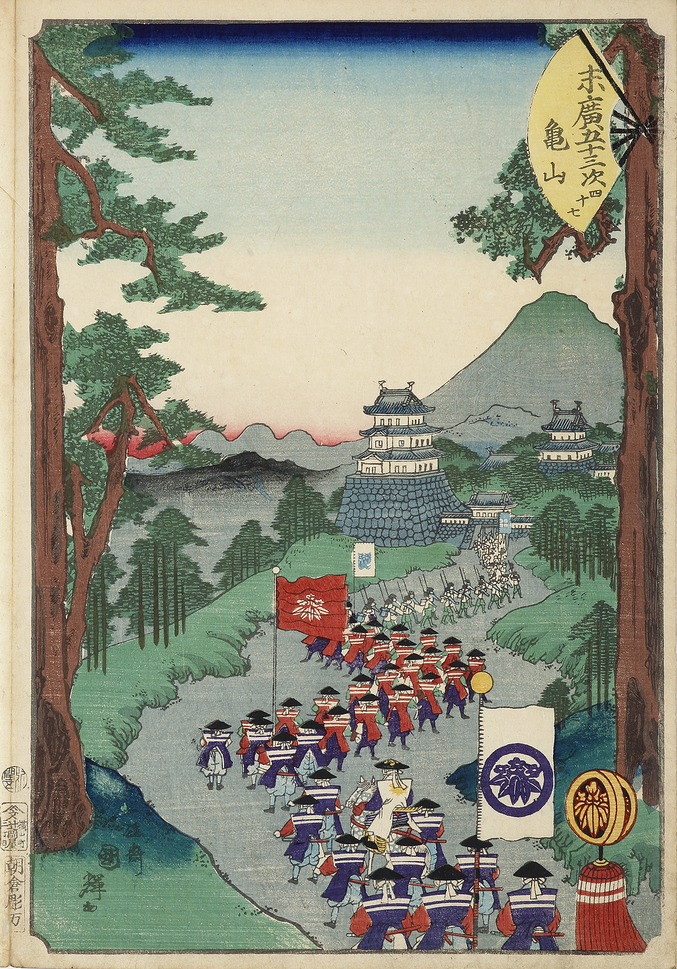 Magnificent woodblock by Utagawa Kuniteru ( 1808-1876) of the post-town of Kameyama, the forty sixth station on the Tokaido*. The prints depicts the shogun’s huge procession passing Kameyama Castle as they enter the town, flying Uma-jirushi* and banners emblazoned with his mon*.