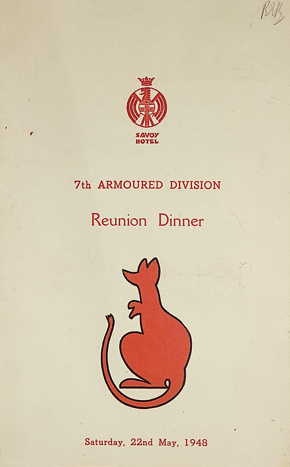 Menu for a reunion of The 7th Armoured Division (Desert Rats) with their Jerboa logo on the cover dated, Saturday, 22nd May, 1948. With inscriptions on inside cover to “Robbie….