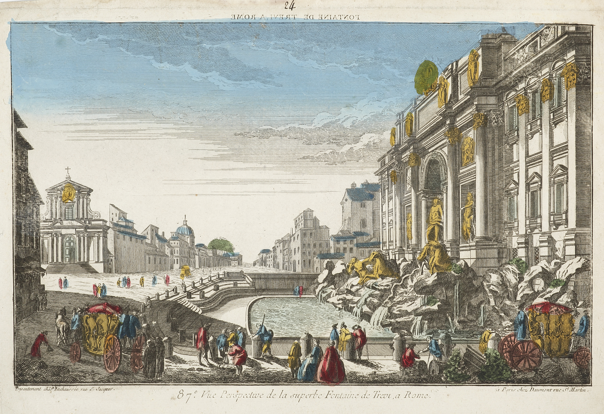Fine c.18th vue Optic of Fontana di Trevi, the most famous of all the fountains in Rome. It was designed by the architect Nicola Salvi and completed by Giuseppe Pannini. It’s name derives from the Latin word Trivium (intersection of three streets); De ‘Crocicchi Street, Poli Street and Delle Muratte Street.