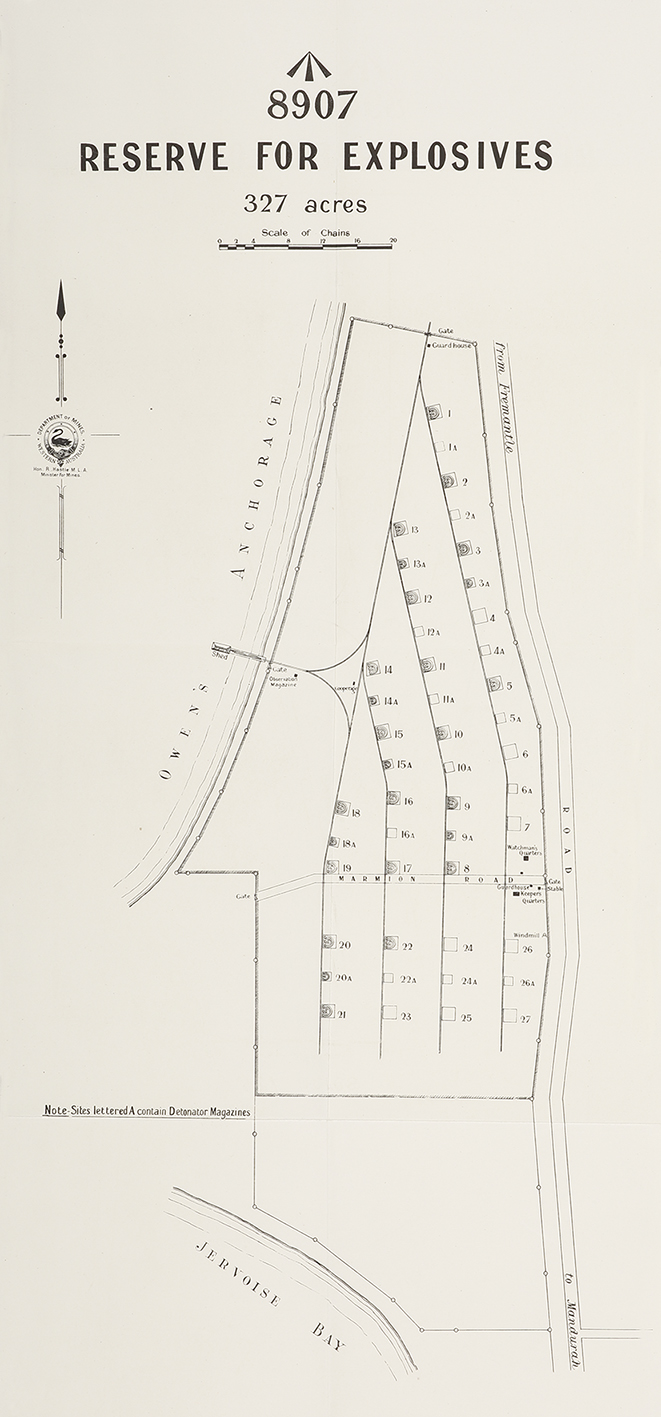 Map showing the explosive reserve at Owen Anchorage, situated between Woodman Point and Fremantle, in Western Australia.