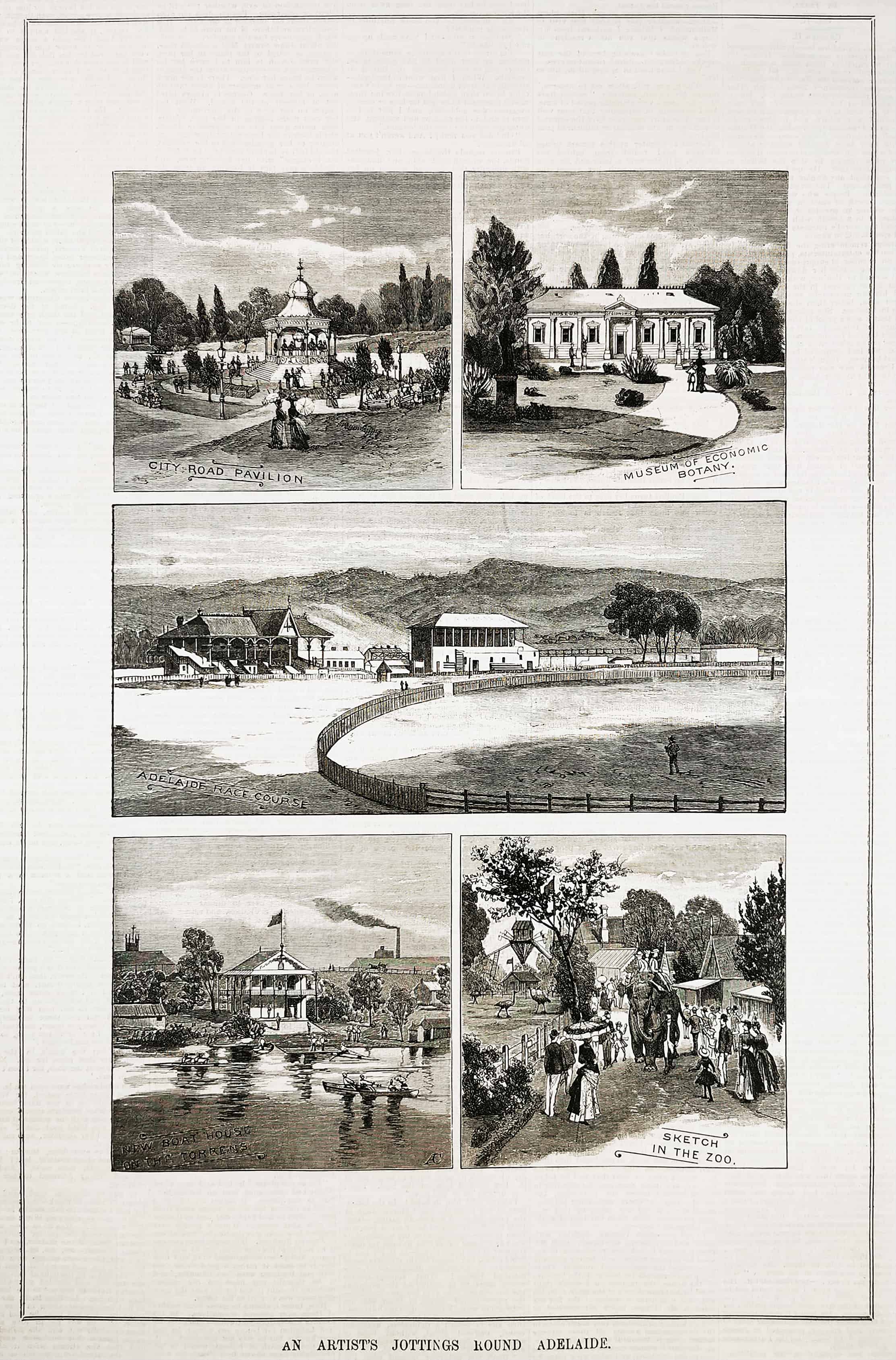Rare engraving of well known places in Adelaide. Inset views, titles from top left clockwise; City Road Pavilion Museum of Economic Botany Adelaide Race Course New Boat House on the Torrens Sketch in the Zoo From the original edition of … Read Full Description