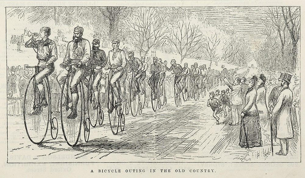 Scarce c.19th black and white engraving of a outing of Penny Farthings in England in 1883.