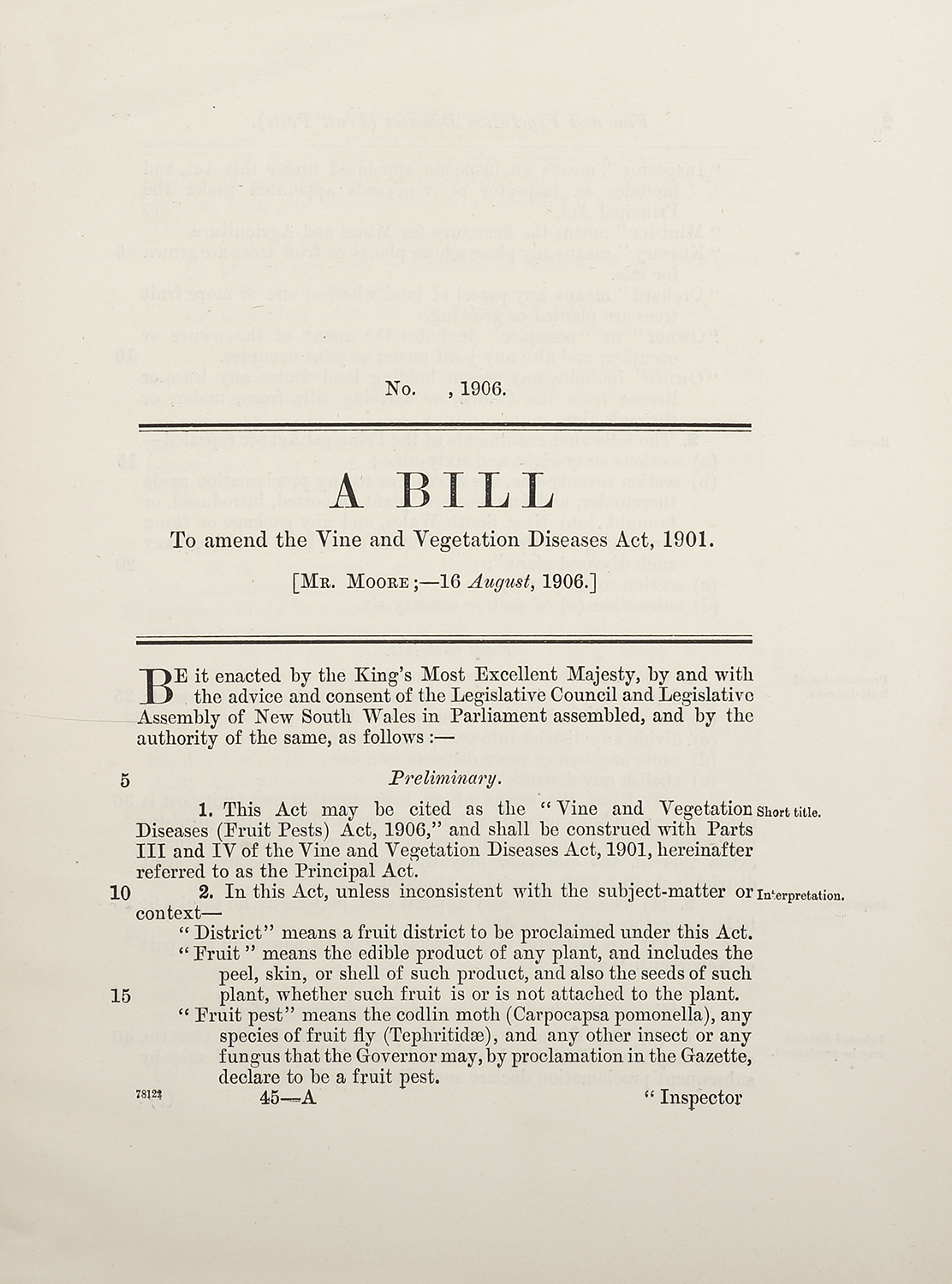 A bill To Amend the Vine and Vegetation Diseases Act, 1901, dated 16th August, 1906. Quarto, 3 pages, soft bound.