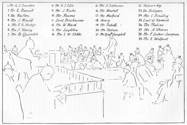 The auctioneer depicted in the engraving as officiating on the present occasion is Mr. E. G. Hodge, of the above-mentioned well-known firm of literary auctioneers, who, attended by his clerk, Mr. Snowdon, is offering a quarto volume, which at the moment is being critically scrutinised by Mr. Reeves overlooked by Mr. Stibbs, two veteran booksellers; the lot is evidently of interest to Mr. Walford, seated upon the left of Mr. Stibbs, and who is keeping a sharp eye upon the auctioneer to see that his bidding is not overlooked. Mr. Quaritch, the Goliath of the trade, may be noticed in his usual well-chosen seat just beneath the auctioneer’s desk, but upon this occasion he is not wearing his wide-awake hat (or “buying hat”, as it is jocularly termed). It is here that the books are usually placed upon the table by the porter who takes them from the shelves at the side, where they are replaced as soon as sold. It is for this reason that most of the buyers collect at this spot, or are seated upon that side of the auction room. Mr. Hodge is a brisk and cheerful salesman, and keeps the attention of all the buyers well engaged from first to last (which is an essential point in a successful auctioneer), and consequently invariably obtains good prices for the goods he sells. The lots being put up and knocked down extremely rapidly it is very dangerous for any buyer to have his attention for an instant taken off the sale, as a slight inattention is frequently rewarded by the loss of a desirable book; instances of this kind often occur.