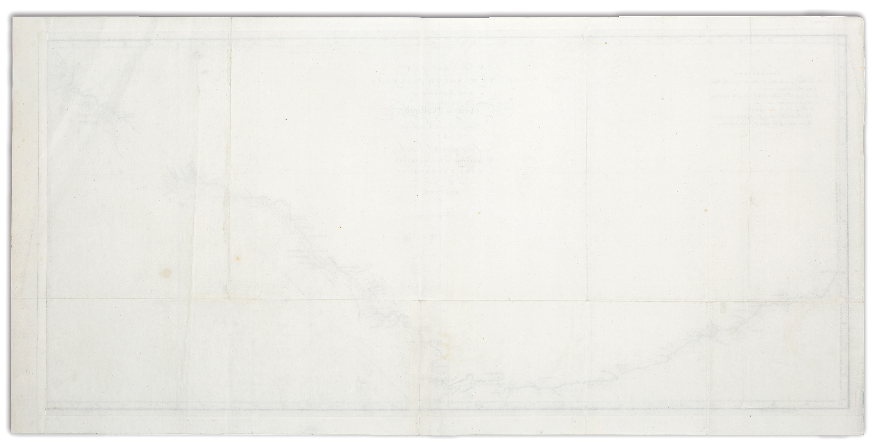 The discoveries made by James Cook in the Endeavour on his first voyage finally resolved the question of Terra Australis Incognito that had puzzled and intrigued explorers and cartographers for centuries. Officially, Cook was sent by the British Admiralty to observe the transit of Venus from Tahiti but prior to his departure he was given secret instructions which set out the true nature of his mission. They instructed that after observing the transit of Venus, he was to sail for the Great Southern Continent. In the event that he found the Continent, he should chart its coasts, obtain information about its people, cultivate their friendship and alliance, and annex any convenient trading posts in the King’s name. Cook first sighted the Australian east coast on 19 April 1770 after sailing west from New Zealand and then sailed north, anchoring at Botany Bay on 29 April 1770, before methodically charting the entire east coast. It was his observations while at Botany Bay that were later used by Joseph Banks to make the case for a penal colony. The voyage almost came to a fatal end when the Endeavour struck the Great Barrier Reef, which Cook subsequently named the Labyrinth. Fortunately, Cook was able to steer the ship clear to Endeavour River, near Cooktown, where she was careened for repairs. The chart is orientated with north to the right.