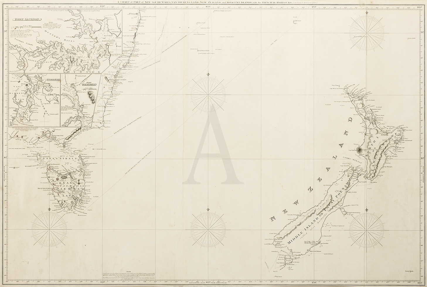 Rare large scale chart of the coast of south eastern Australia from Cape Nelson, Victoria, north to Byron Bay and New Zealand. Insets of Port Jackson, Storm Bay and Port Dalrymple.