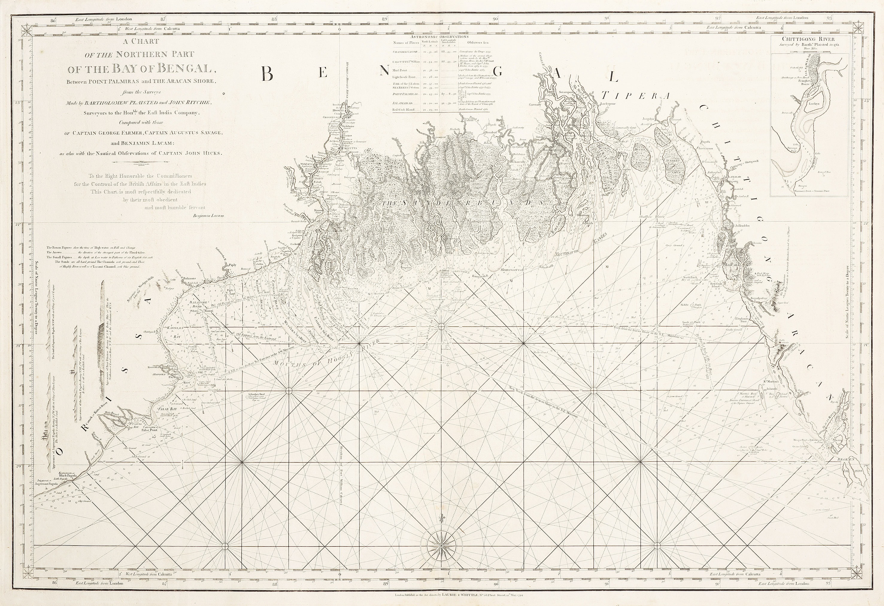 The chart covers the northern part of the Bay of Bengal between Point Palmiras and the Aracan Shore: from the surveys made by Bartholomew Plaisted and John Ritchie, surveyors to the Honble. the East India Company, compared with those of Captain George Farmer, Captain Augustus Savage, and Benjamin Lacam: as also with the nautical observations of Captain John Hicks: to the Right Honorable the Commissioners for the controul of the British Affairs in the East Indies this chart is most respectfully dedicated by their most obedient and most humble servant Benjamin Lacam.