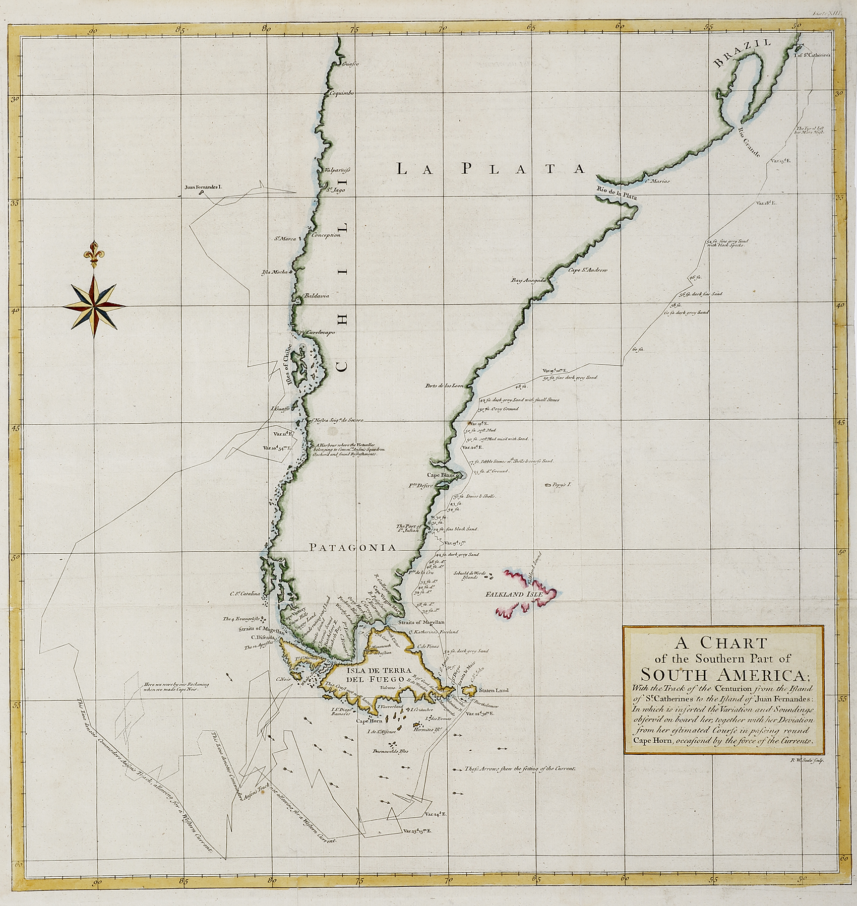 Scarce engraved map showing the tracks of Lord Byron in the Centurion on the coasts of South America, from the English edition of Lord Anson’s famous circumnavigation of the world.