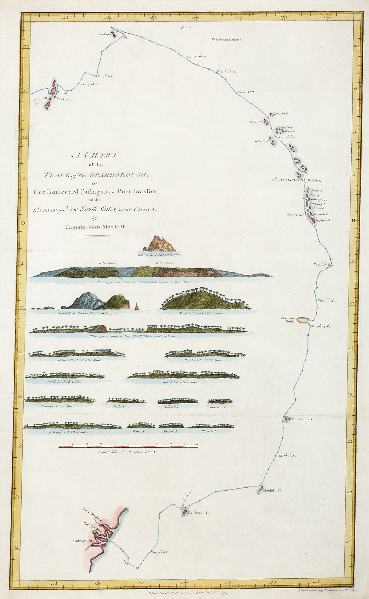 Scarce C.18th map showing the route of the convict ship, Scarborough from Sydney towards China and coastal profiles of several islands including Lord Howe and Norfolk. The Scarborough was a 418 ton ship, captained by John Marshall, which carried 208 male convicts as part of the First Fleet to Botany Bay. After transporting the convicts, Marshall sailed to China and charted the previously unknown Gilbert and Marshall islands, the latter which were originally named Lord Mulgrave’s Range.