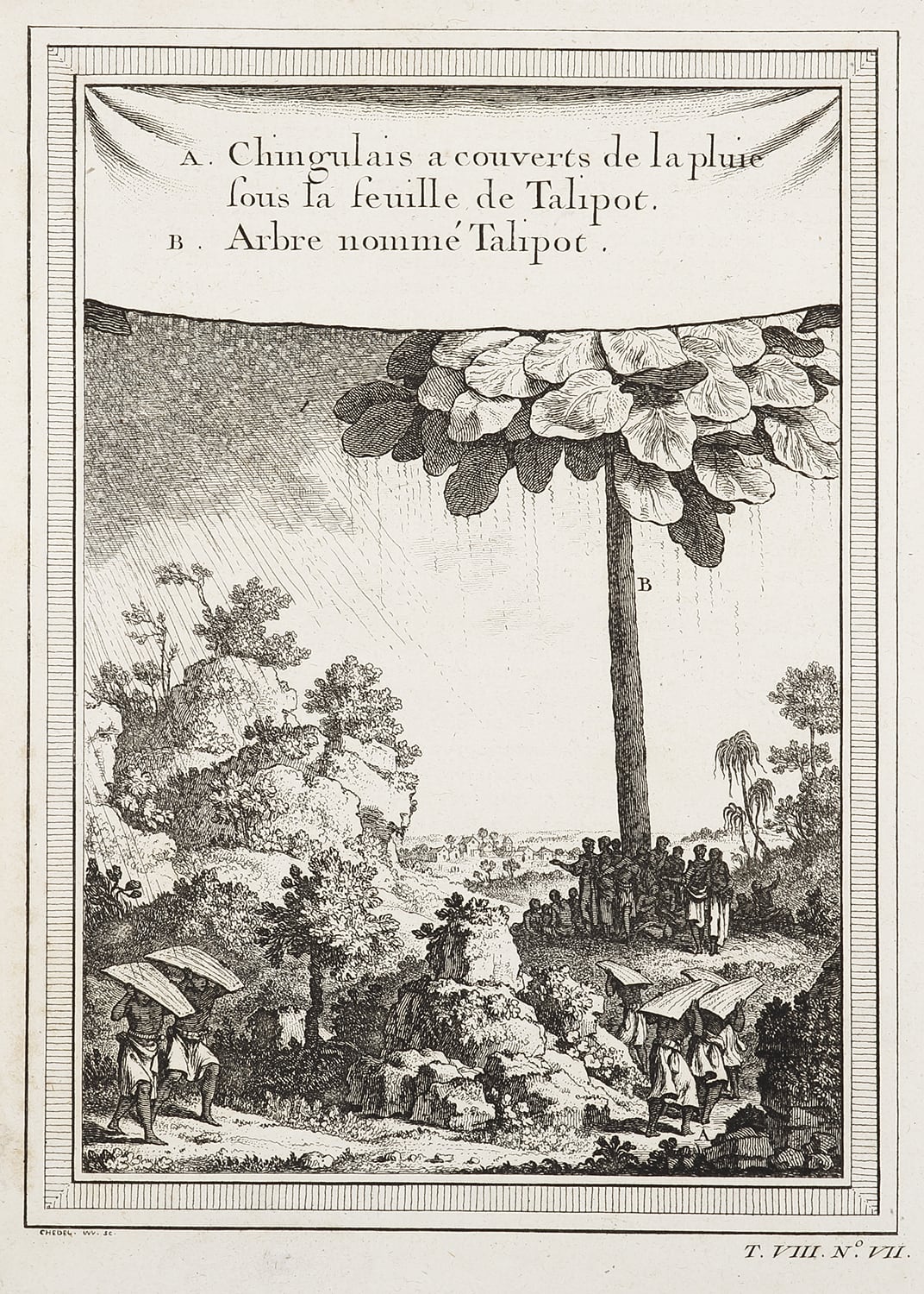 Scarce c.18th French engraving showing a group of Celanese sheltering under a Talipot Palm.