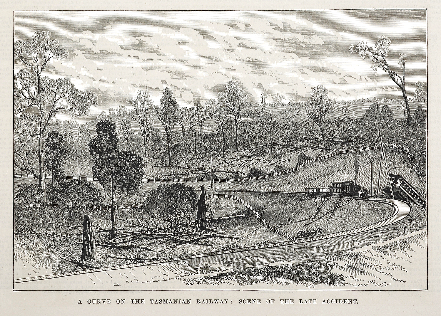 Scarce colonial engraving of an accident on the Tasmanian Railway in 1877.