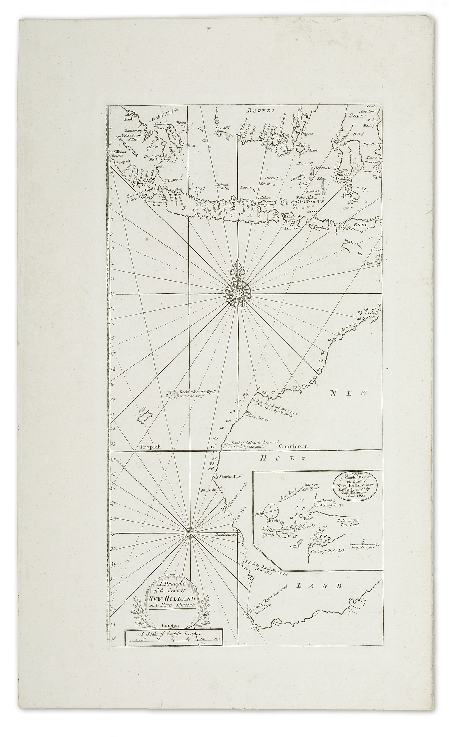 The first English chart of the Western Australian coast and the first to show the discoveries made by William Dampier at Shark Bay in August 1699. The map has a prominent compass rose at centre, numerous rhumb lines and an … Read Full Description