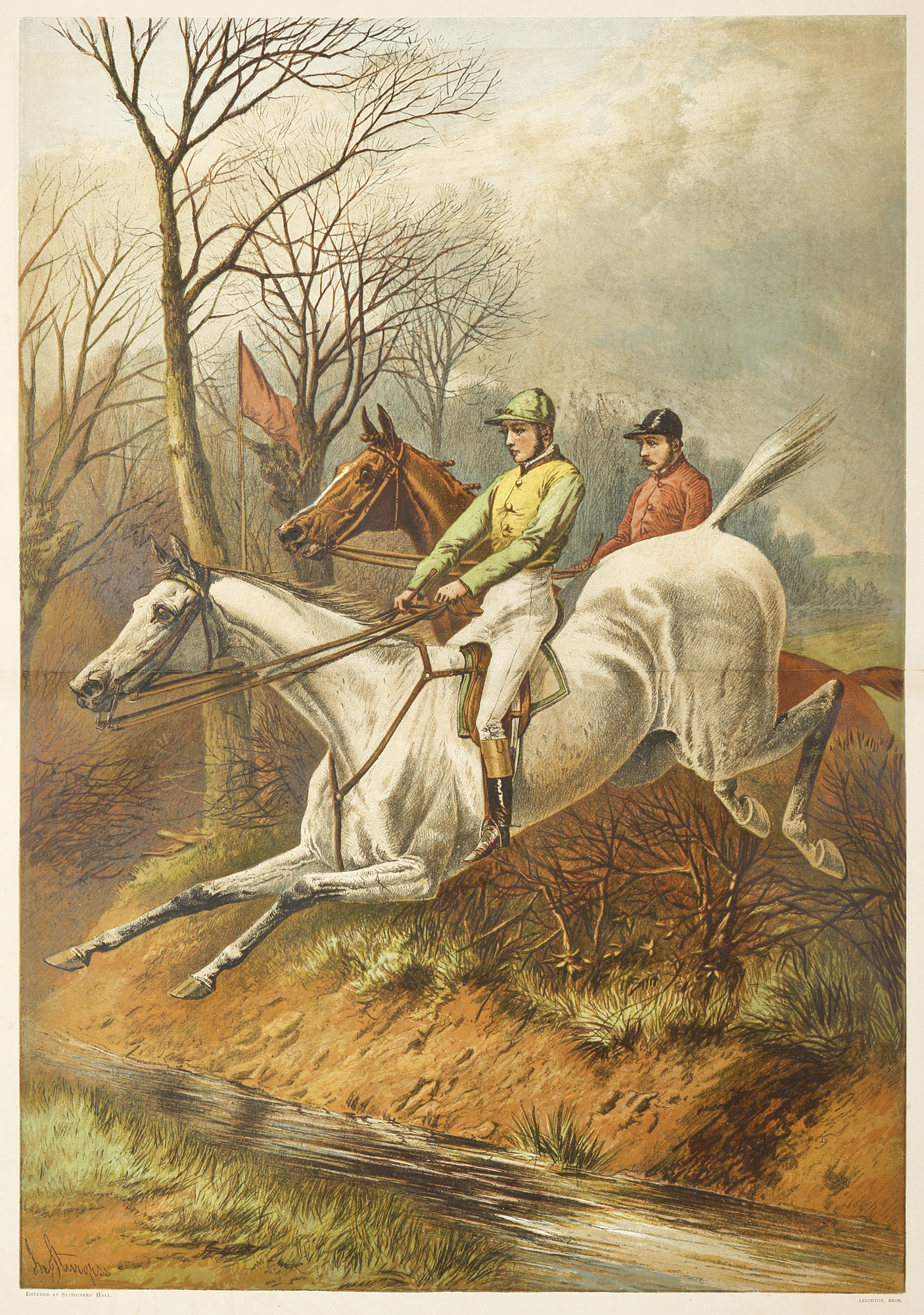 Large colour supplement to the original edition of the Illustrated London News of two horses jumping a fence and water hazard in a a steeplechase.