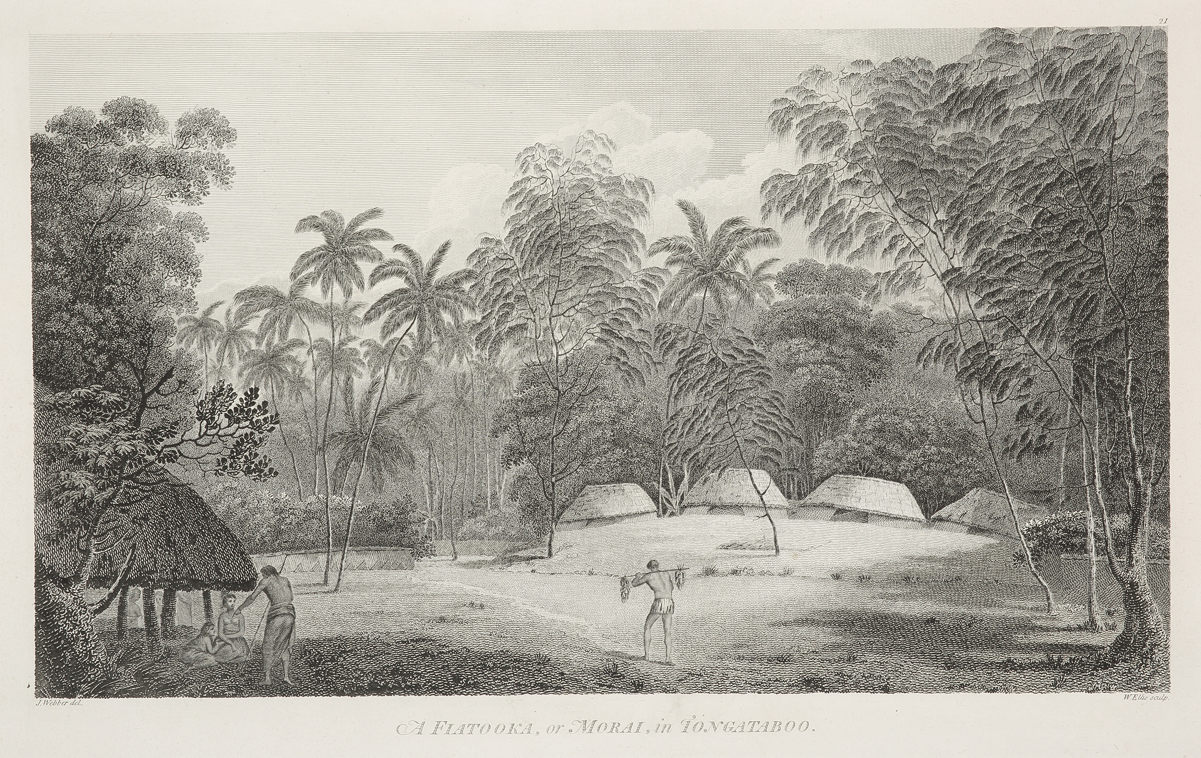 While on Tongatapu from 10 June to 10 July 1777, Cook and his men recorded Tongan ceremonies and culture. In this view Webber depicts a fa’itoka (burying ground).