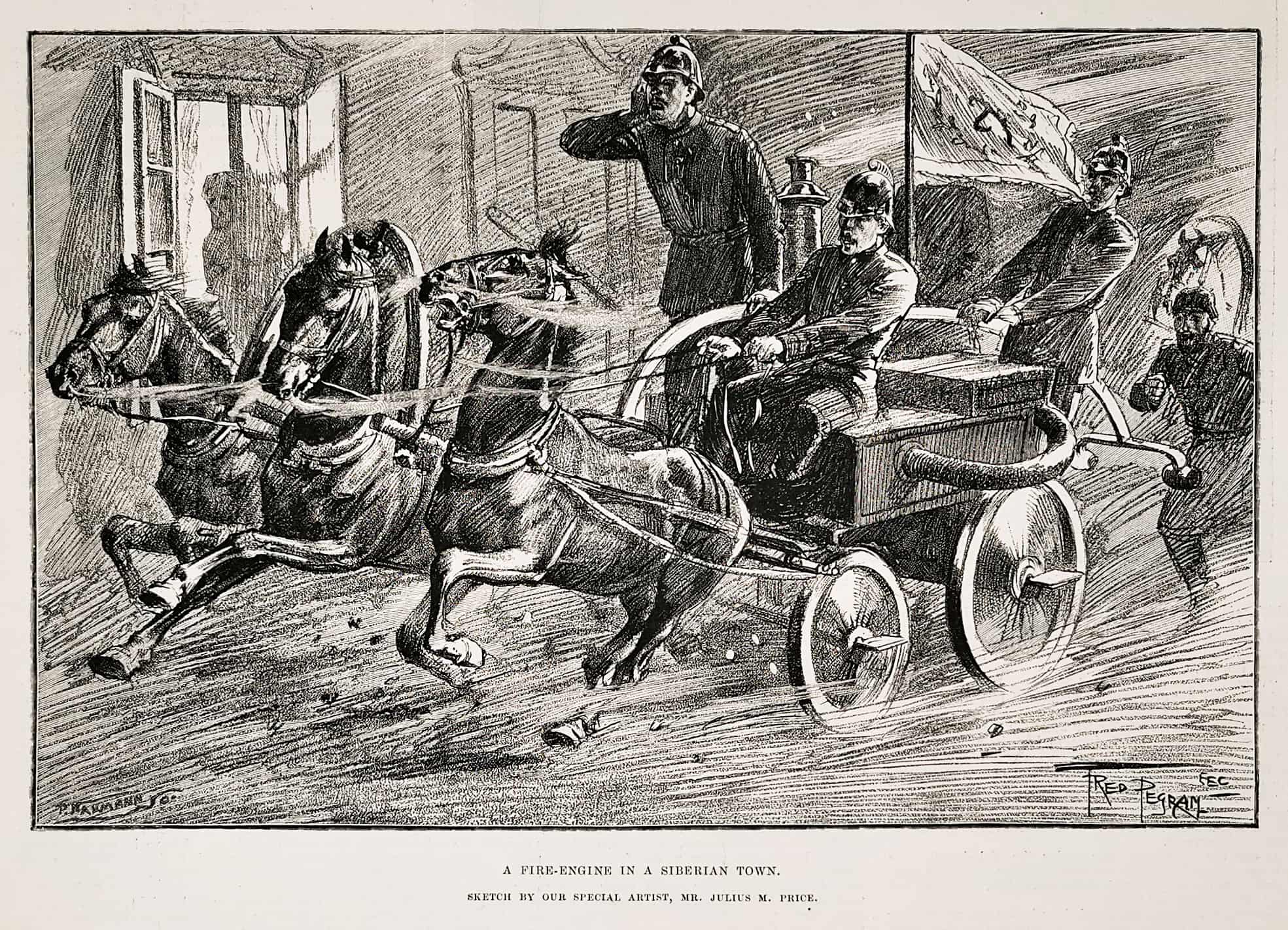 Fabulous, detailed engraving of an early horse drawn fire wagon racing to a fire inSiberia. From the original edition of the Graphic