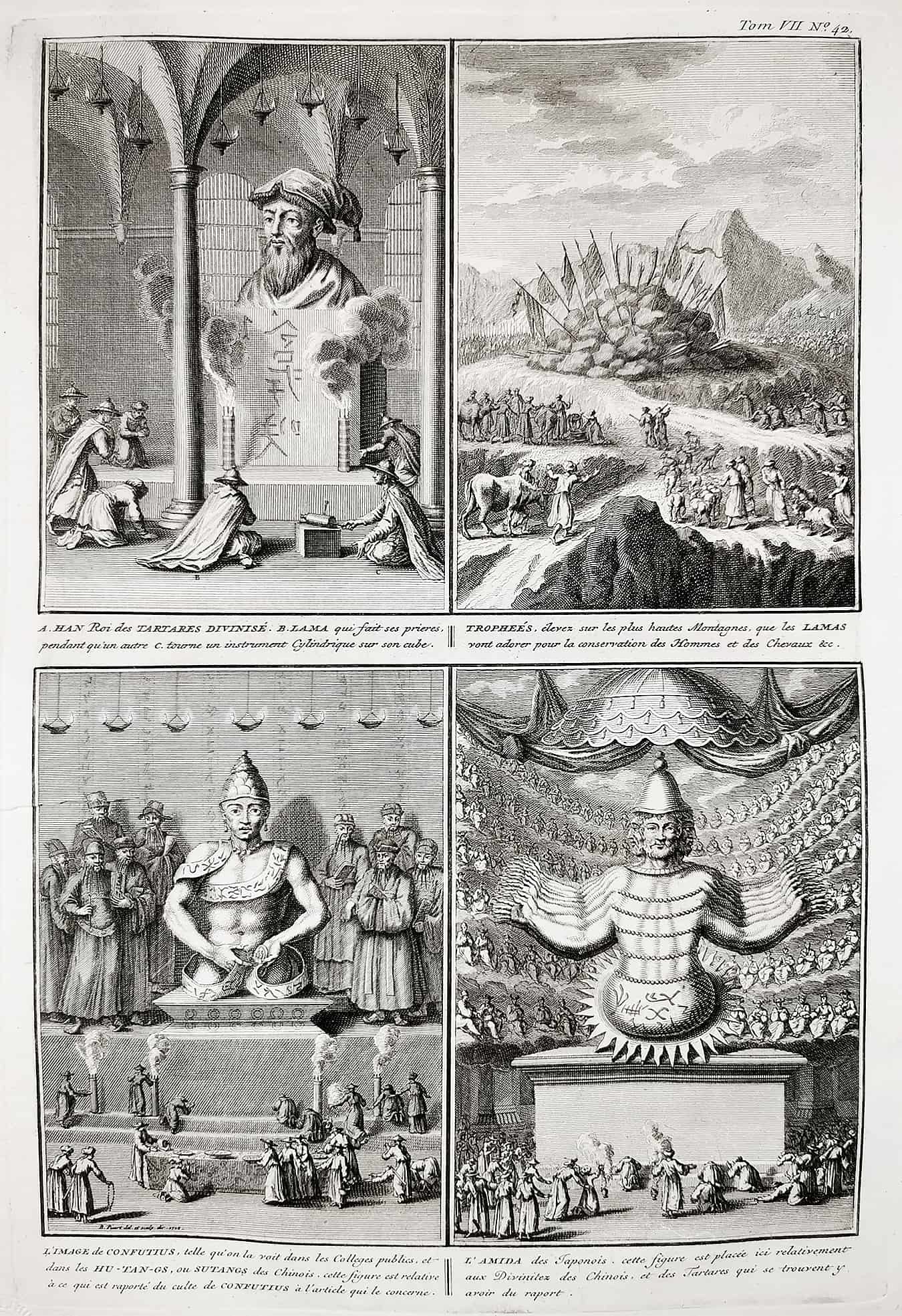“To Han King of the Tartars Divinized./Trophies erected on the highest mountains, which lamas worshipped there for the preservation of Men and Horses./The image of confutius…./L’amida of Japanese…” From Denis Diderot’s, Encyclopaedia which was a monument in the history of … Read Full Description