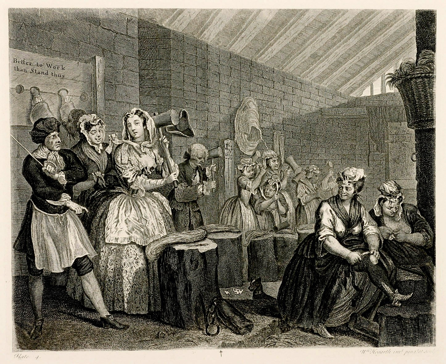Plate 4: Moll now in Bridewell prison, shown with other inmates (including prostitutes and a card-player) beating hemp under the supervision of a warder holding a cane; Moll is still dressed in her finery, but a one-eyed female attendant fingers the lace lappet hanging from her cap and her erstwhile serving-woman is trying on her fashionable shoes and stockings; beyond, a man stands with his hands in a pillory.