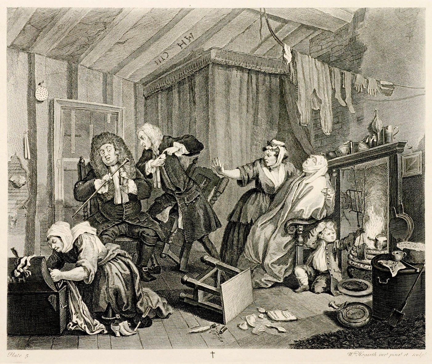 Plate 5: A squalid room where Moll Hackabout, wrapped in a sheet, is dying while two doctors (Richard Rock and Jean Misaubin) argue over their remedies; her serving-woman calls for attention for the invalid, another woman rifles through a trunk, and a small boy turns a joint of meat roasting in front of the fire.