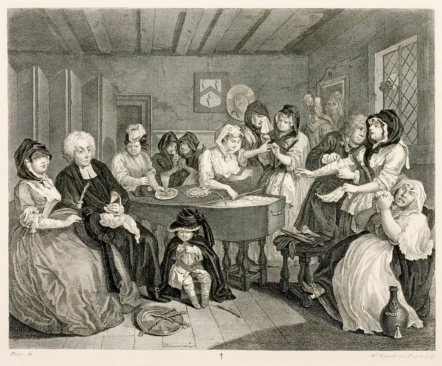 Plate 6: A dilapidated room with Moll’s friends, mostly prostitutes, gathered around her open coffin; to left, a clergyman gropes beneath a woman’s skirt, to right, the undertaker pays court to another who picks a handkerchief from his pocket; in the foreground sits Moll’s small son playing with a spinning top.