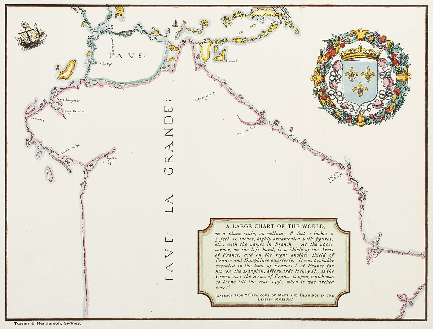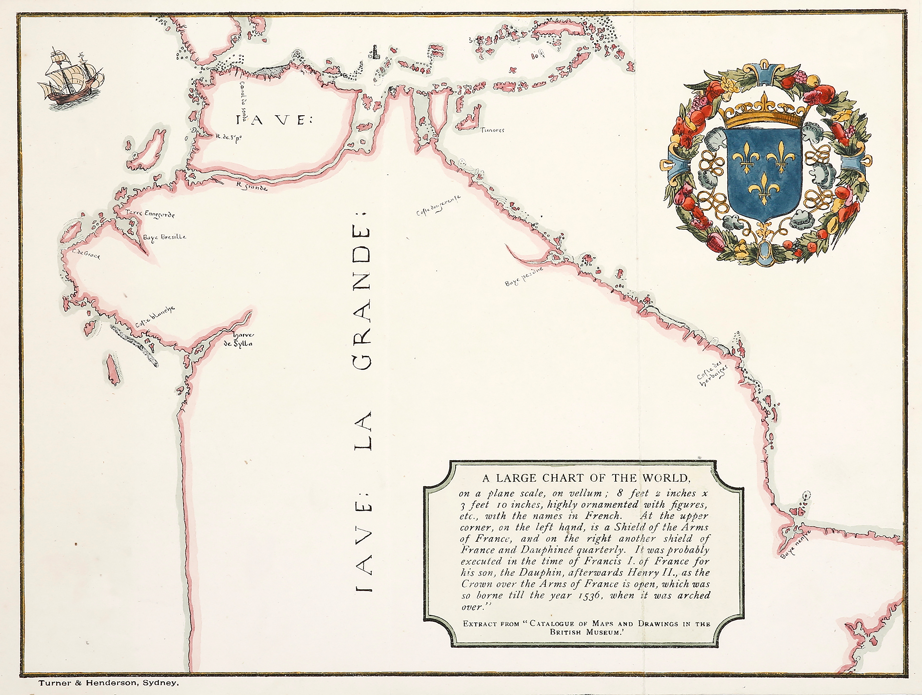 It is thought to be the earliest known map of Australia. The name Iave la Grande [i.e. Java] is written vertically on the Australian continent. When the Dauphin map is redrawn to the Mercator projection, it does resemble Australia. Shows Java and Sumatra situated very close to the Australian coastline. With place names in Portuguese.
